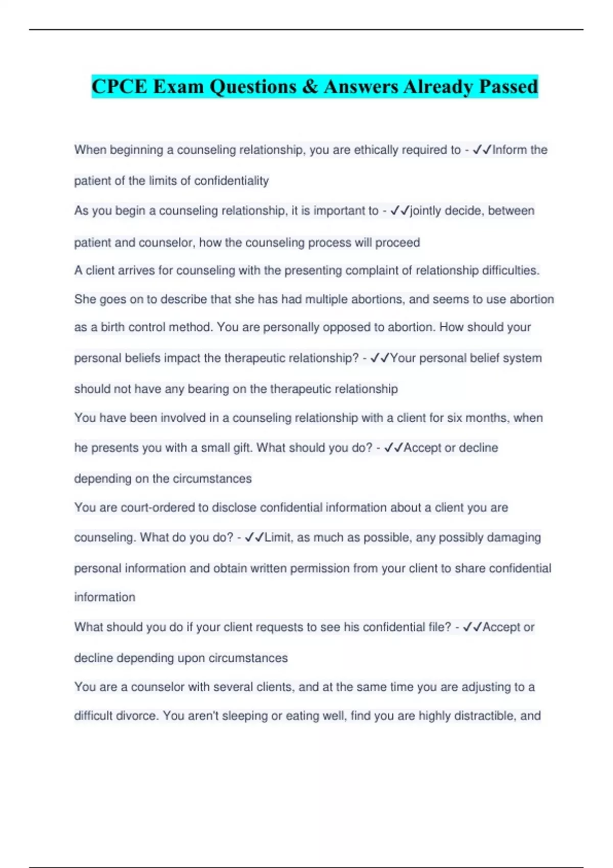 CPCE Exam Questions & Answers Already Passed When beginning a counseling relationship, you are ethically required to - ️️ Inform the patient of the limits of confidentiality As you begin a counseling relationship, it is important to - ️️ jointly decide, between patient and counselor, how the counseling process will proceed A client arrives for counseling with the presenting complaint of relationship difficulties. She goes on to describe that she has had multiple abortions, and seems to use abortion as a birth control method. You are personally opposed to abortion. How should your personal beliefs impact the therapeutic relationship? - ️️ Your personal belief system should not have any bearing on the therapeutic relationship You have been involved in a counseling relationship with a client for six months, when he presents you with a small gift. What should you do? - ️️ Accept or decline depending on the circumstances You are court-ordered to disclose confidential information about a client you are counseling. What do you do? - ️️ Limit, as much as possible, any possibly damaging personal information and obtain written permission from your client to share confidential information What should you do if your client requests to see his confidential file? - ️️ Accept or decline depending upon circumstances You are a counselor with several clients, and at the same time you are adjusting to a difficult divorce. You aren't sleeping or eating well, find you are highly distractible, and