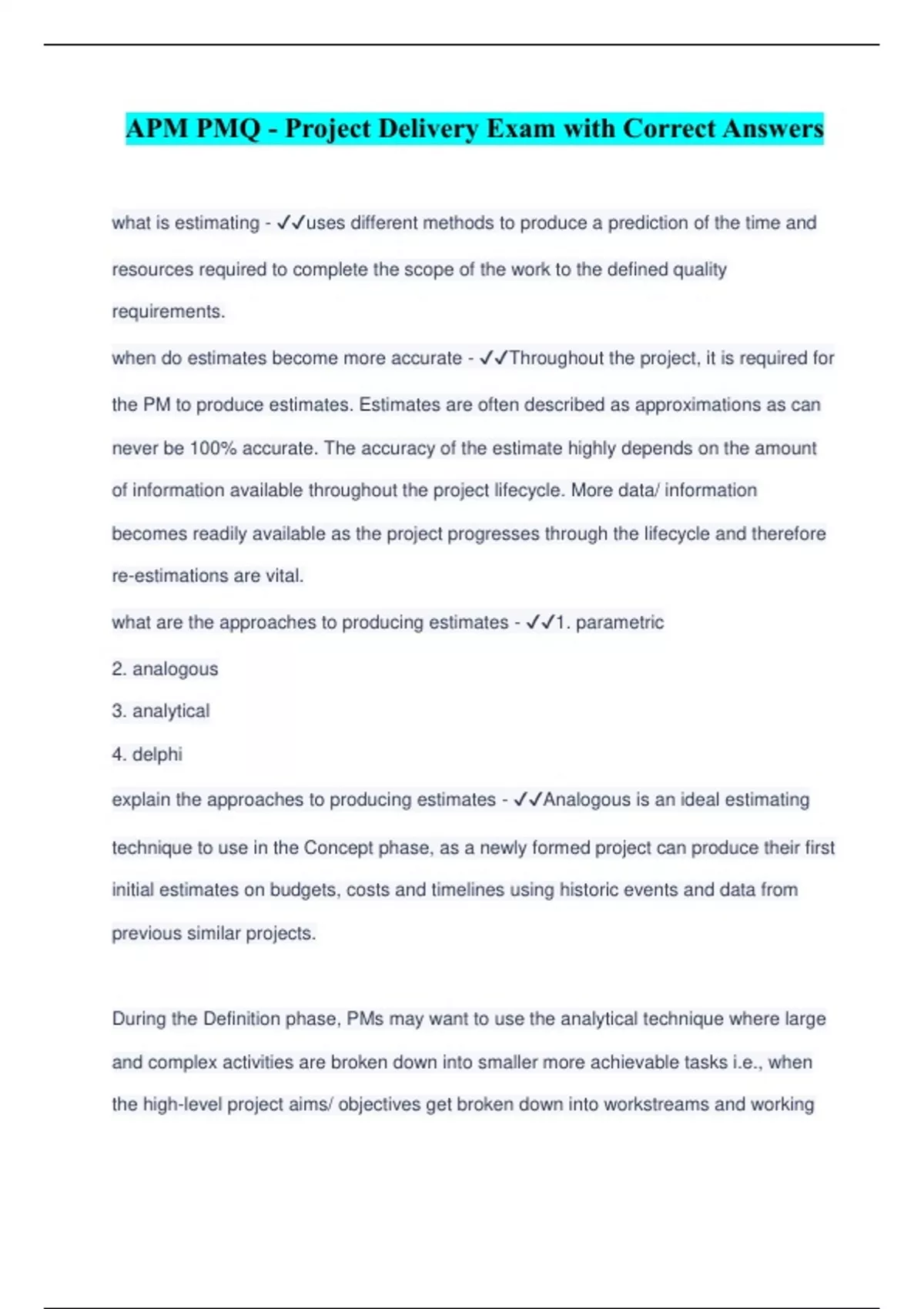 APM PMQ - Project Delivery Exam with Correct Answers what is estimating - ️️ uses different methods to produce a prediction of the time and resources required to complete the scope of the work to the defined quality requirements. when do estimates become more accurate - ️️ Throughout the project, it is required for the PM to produce estimates. Estimates are often described as approximations as can never be 100% accurate. The accuracy of the estimate highly depends on the amount of information available throughout the project lifecycle. More data/ information becomes readily available as the project progresses through the lifecycle and therefore re-estimations are vital. what are the approaches to producing estimates - ️️ 1. parametric 2. analogous 3. analytical 4. delphi explain the approaches to producing estimates - ️️ Analogous is an ideal estimating technique to use in the Concept phase, as a newly formed project can produce their first initial estimates on budgets, costs and timelines using historic events and data from previous similar projects. During the Definition phase, PMs may want to use the analytical technique where large and complex activities are broken down into smaller more achievable tasks i.e., when the high-level project aims/ objectives get broken down into workstreams and working