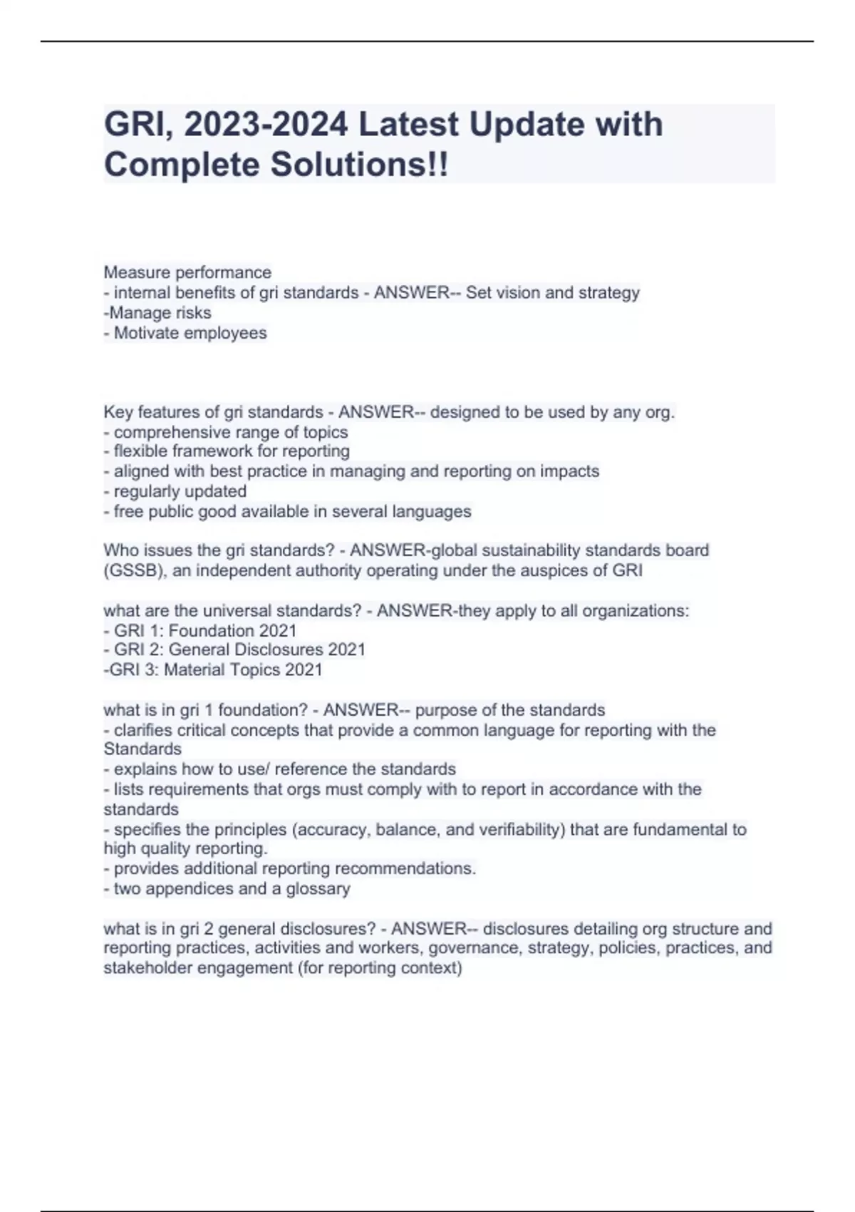 Measure performance - internal benefits of gri standards - ANSWER-- Set vision and strategy -Manage risks - Motivate employees Key features of gri standards - ANSWER-- designed to be used by any org. - comprehensive range of topics - flexible framework for reporting - aligned with best practice in managing and reporting on impacts - regularly updated - free public good available in several languages Who issues the gri standards? - ANSWER-global sustainability standards board (GSSB), an independent authority operating under the auspices of GRI what are the universal standards? - ANSWER-they apply to all organizations: - GRI 1: Foundation 2021 - GRI 2: General Disclosures 2021 -GRI 3: Material Topics 2021 what is in gri 1 foundation? - ANSWER-- purpose of the standards - clarifies critical concepts that provide a common language for reporting with the Standards - explains how to use/ reference the standards - lists requirements that orgs must comply with to report in accordance with the standards - specifies the principles (accuracy, balance, and verifiability) that are fundamental to high quality reporting. - provides additional reporting recommendations. - two appendices and a glossary what is in gri 2 general disclosures? - ANSWER-- disclosures detailing org structure and reporting practices, activities and workers, governance, strategy, policies, practices, and stakeholder engagement (for reporting context) what is in gri 3 material topics? - ANSWER-- explains and reports on steps by which an org determines and manages its material topics and how the sector standards are used in the process. Impacts are grouped into topics for cohesive reporting. What is in each sector standard? - ANSWER-lists topics that are likely to be material for an organization given a specific sector based on the sector's most significant impacts. It also lists disclosures from the GRI Topic Standards for an organization to report. Any organization that wishes to state that its report has been prepared in accordance with the Standards is required to use _________________________ when determining its material topics. - ANSWER-the applicable sector standards What are the topic standards? - ANSWER-final series in system of GRI standards, each topic standard is dedicated to a particular topic and contains disclosures relevant to that topic.