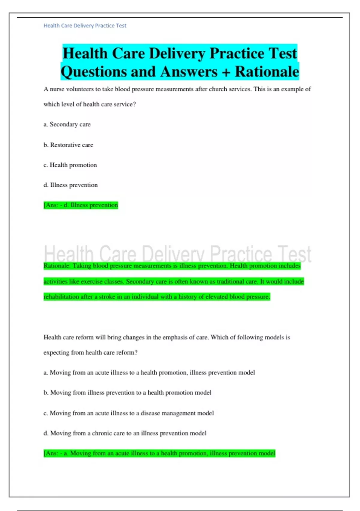 Health Care Delivery Practice Test Questions and Answers + Rationale