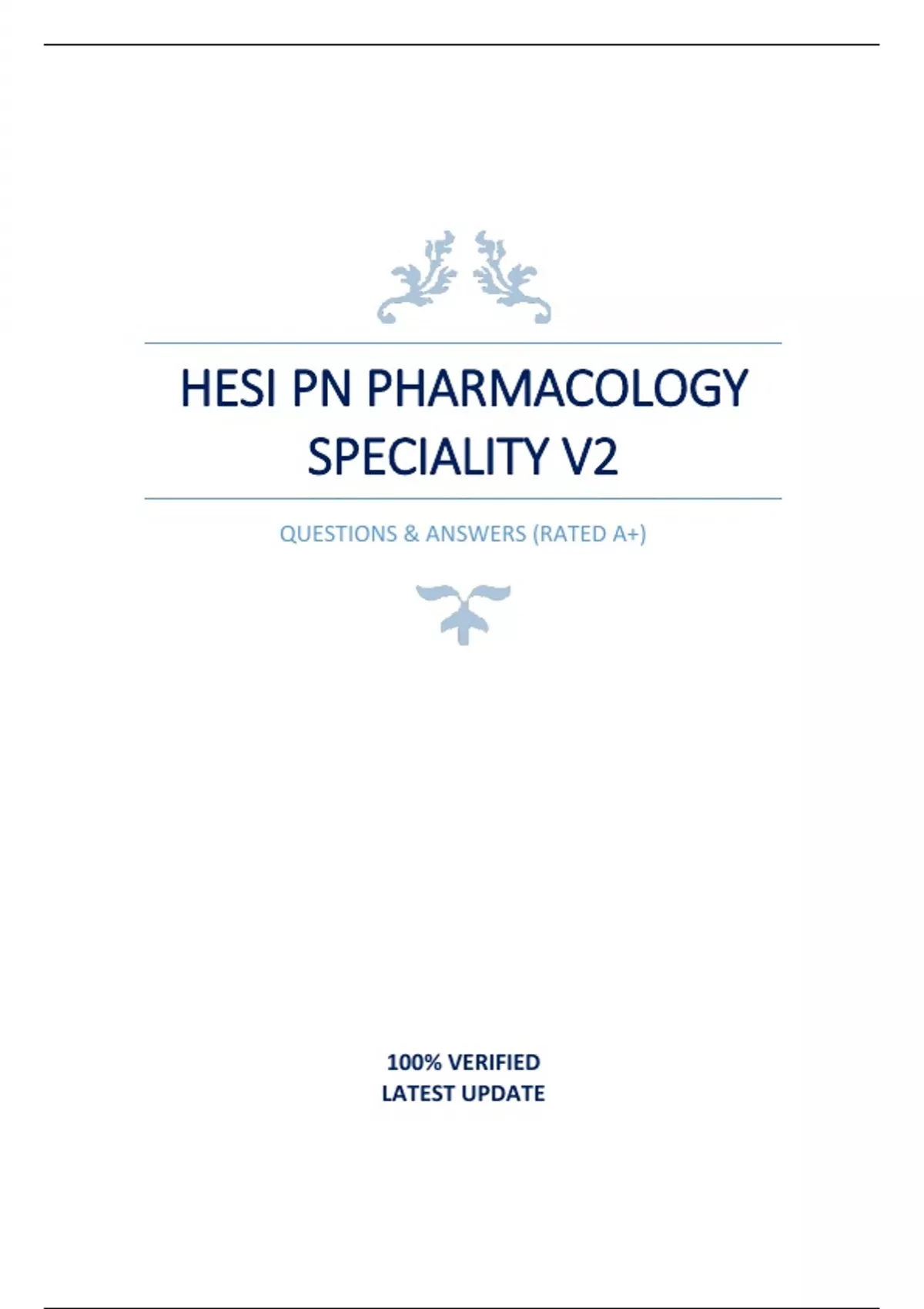 HESI PN PHARMACOLOGY SPECIALITY V2HESI PN PHARMACOLOGY SPECIALITY V2 QUESTIONS & ANSWERS (RATED A+) 100% VERIFIED LATEST UPDATE 1) A client is being treated for hyperthyridism with propylthiouracil (PTU). The LPN/LVN knows that the action of this drug is to: A. decrease the amount of thyroid stimulating hormone circulating in the blood. B. increase the amount of thyroid-stimulating hormone circulating in the blood. C. increase the amount of T4 and decrease the amount of T3 produced by the thyroid. D. inhibit synthesis of T3 and T4 by the thyroid gland. D. PTU is an adjunct therapy used to control hyperthyroidism by inhibiting production of thyroid hormones. It is often prescribed in prep for thyroidectomy or radioactive iodine therapy 2) A female client with RA takes ibuprofen (motrin) 600mg PO 4xday. To preven GI bleeding, misoprostol (cytotec) 100mcg PO is prescribed. Which information is most important for the nurse to include in client teaching? A. use contraception during intercourse B. ensure the cytotec is taken on an empty stomach C. encourage oral fluid intake to prevent constipation D. take cytotec 30min prior to motrin A. Use contraception during intercourse. Cytotec, a synthetic form of prostaglandin, is classified as pregnancy category X and can act as an abortifacient, so the client should be instructed to use contraception during intercourse to prevent loss of early pregnancy 3) Dobutamine (Dobutrex) is an emergency drug most commonly prescribed for a client with which condition? A) Shock. B) Asthma. C) Hypotension. D) Heart failure D. Heart Failure Dobutamine is a beta-1 adrenergic agonist that is indicated for short term use in cardiac decompensation or heart failure (D) related to reduced cardiac contractility due to organic heart disease or cardiac surgical procedures. Alpha and beta adrenergic agonists, such as epinephrine and dopamine, are sympathomimetics used in the treatment of shock (A). Other selective beta-2 adrenergic agonists, such as terbutaline and isoproterenol, are indicated in the treatment of asthma (B). Although dobutamine improves cardiac output, it is not used to treat hypotension ( C ). 4) Which medications should the nurse caution the client about taking while receiving an opioid analgesic? A. Antacids. B. Benzodiasepines C. Antihypertensives D. Oral antidiabetics B. B. Benzodiasepines Respiratory depression increases with the concurrent use of opioid analgesics and other cns depressant agents, such as alcohol, barbiturates, and benzodiasepines 5) Which client should the LPN/LVN identify as being at the highest risk for complications during the use of an opioid analgesic? A. an older client with type 2 diabetes B. A client with chronic rheumatoid arthritis C. A client with a open compound fracture D. A young adult with inflammatory bowel disease D. A young adult with inflammatory bowel disease 6) Which change in data indicates to the nurse the desired effect of the angiotensin II receptor antagonist valsartan (Diovan) has been achieved A. Dependent edema reduced form +3 to +1 B. Serum HDL increased from 35 to 55mg/dl C. PUlse rate reduced from 150 to 90 beats/min D. Blood pressure reduced from 160/90 to 130.80 D. D. Blood pressure reduced from 160/90 to 130.80 angiotensin II receptor antagonist (blocker), prescribed from treatment of HTN. The desired effect is a decrease in blood pressure. 7) A client with heart failure is prescribed spironolactone (Aldactone). Which information is most important for the LPN/LVN to provide to the client about diet modifications? A) Do not add salt to foods during preparation. B) Refrain for eating foods high in potassium. C) Restrict fluid intake to 1000 ml per day. D) Increase intake of milk and milk products. B. Spironolactone (Aldactone), an aldosterone antagonist, is a potassiumsparing diuretic, so a diet high in potassium should be avoided (B), including potassium salt substitutes, which can lead to hyperkalemia. Although (A) is a common diet modification in heart failure, the risk of hyperkalemia is more important with Aldactone. Restriction of fluids (C) or increasing milk and milk products (D) are not indicated with this prescription. 8) The nurse is assessing the effectiveness of high dose aspirin therapy for an 88-year-old client with arthritis. The client reports that she can't hear the nurse's questions because her ears are ringing. What action should the nurse implement? A) Refer the client to an audiologist for evaluation of her hearing. B) Advise the client that this is a common side effect of aspirin therapy. C) Notify the healthcare provider of this finding immediately. D) Ask the client to turn off her hearing aid during the exam. C. Notify the healthcare provider of this finding immediately. Tinnitus is an early sign of salicylate toxicity. The healthcare provider should be notified immediately (C), and the medication discontinued. (A and D) are not needed, and (B) is inaccurate. 9) The healthcare provider prescribes naproxen (Naproxen) twice daily for a client with osteoarthritis of the hands. The client tells the nurse that the drug does not seem to be effective after three weeks. Which is the best response for the nurse to provide? A) The frequency of the dosing is necessary to increase the effectiveness. B) Therapeutic blood levels of this drug are reached in 4 to 6 weeks. C) Another type of nonsteroidal antiinflammatory drug may be indicated. D) Systemic corticosteroids are the next drugs of choice for pain relief. C. Another type of nonsteroidal antiinflammatory drug may be indicated. Individual responses to nonsteroidal antiinflammatory drugs are variable, so (C) is the best response. Naproxen is usually prescribed every 8 hours, so (A) is not indicated. The peak for naproxen is one to two hours, not ( B). Corticosteroids are not indicated for osteoarthritis (D ). 10) An older client with a decreased percentage of lean body mass is likely to receive a prescription that is adjusted based on