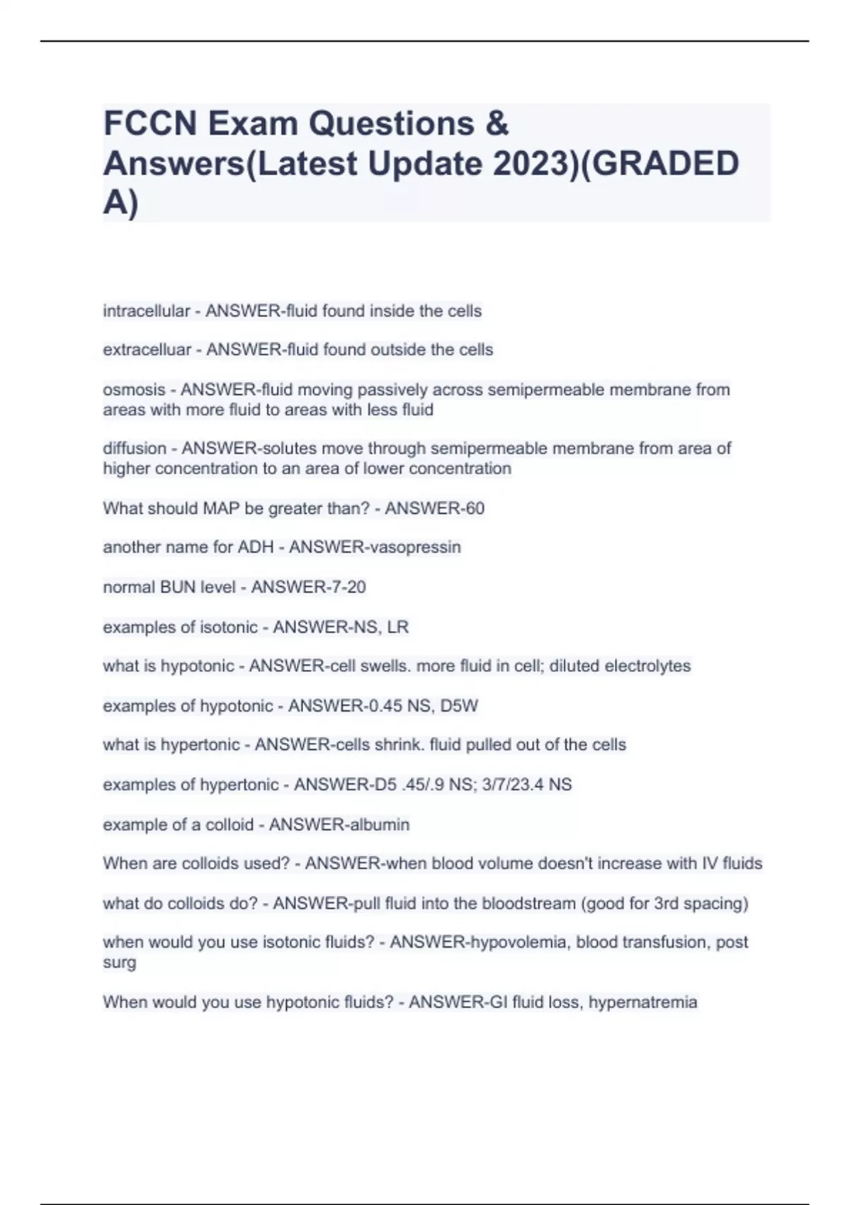 intracellular - ANSWER-fluid found inside the cells extracelluar - ANSWER-fluid found outside the cells osmosis - ANSWER-fluid moving passively across semipermeable membrane from areas with more fluid to areas with less fluid diffusion - ANSWER-solutes move through semipermeable membrane from area of higher concentration to an area of lower concentration What should MAP be greater than? - ANSWER-60 another name for ADH - ANSWER-vasopressin normal BUN level - ANSWER-7-20 examples of isotonic - ANSWER-NS, LR what is hypotonic - ANSWER-cell swells. more fluid in cell; diluted electrolytes examples of hypotonic - ANSWER-0.45 NS, D5W what is hypertonic - ANSWER-cells shrink. fluid pulled out of the cells examples of hypertonic - ANSWER-D5 .45/.9 NS; 3/7/23.4 NS example of a colloid - ANSWER-albumin When are colloids used? - ANSWER-when blood volume doesn't increase with IV fluids what do colloids do? - ANSWER-pull fluid into the bloodstream (good for 3rd spacing) when would you use isotonic fluids? - ANSWER-hypovolemia, blood transfusion, post surg When