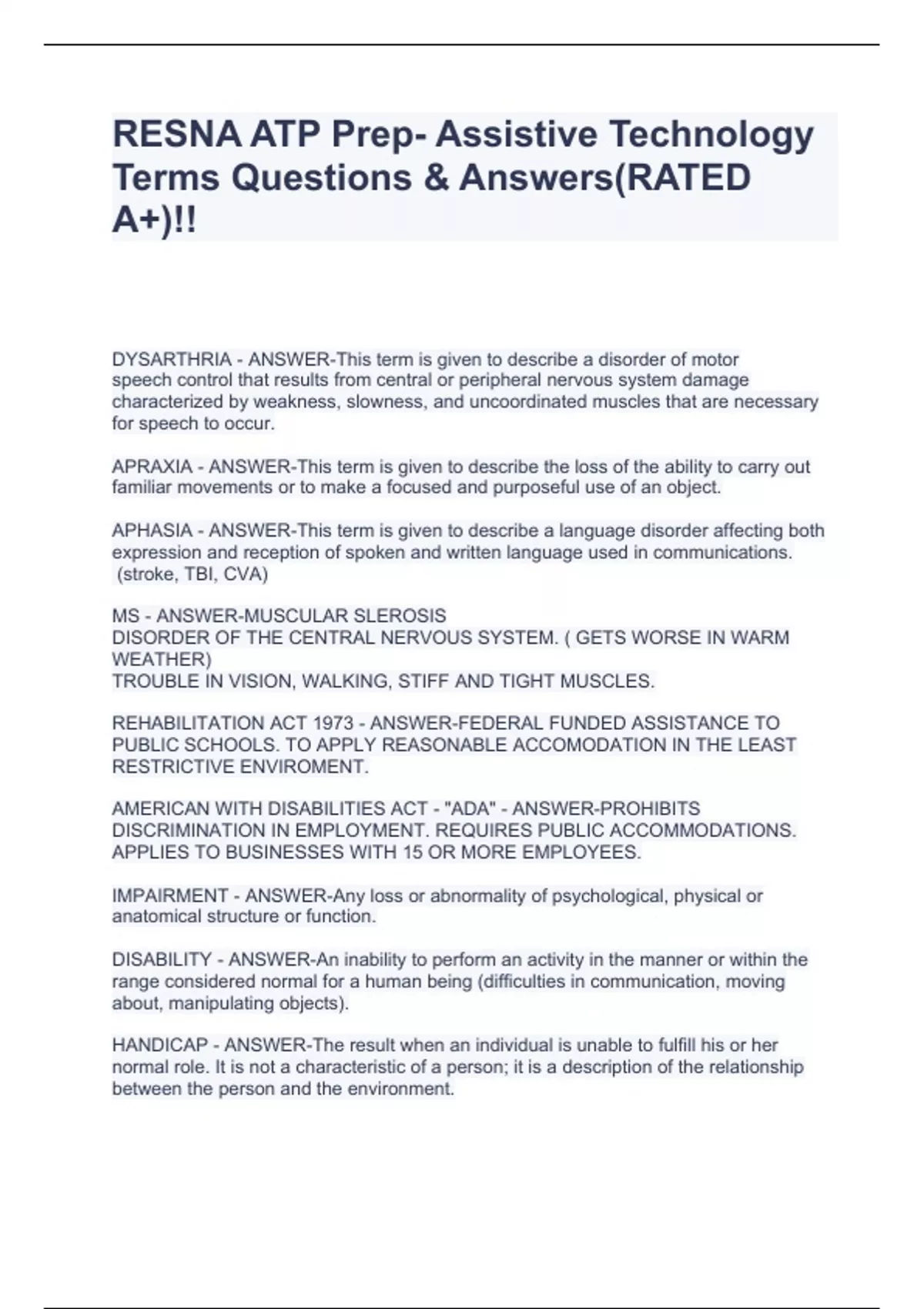 RESNA ATP Prep- Assistive Technology Terms Questions & Answers(RATED A+)!!