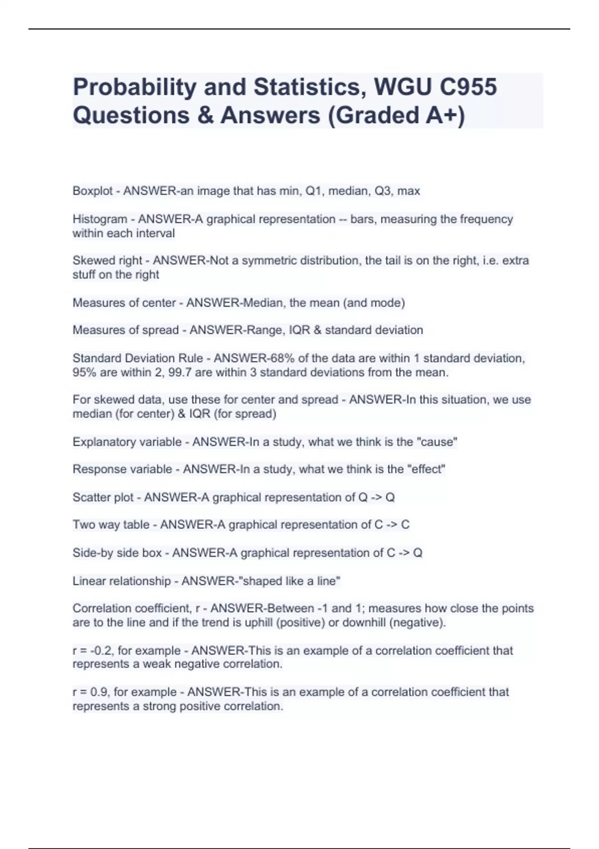 Probability and Statistics, WGU C955 Questions & Answers (Graded A+)