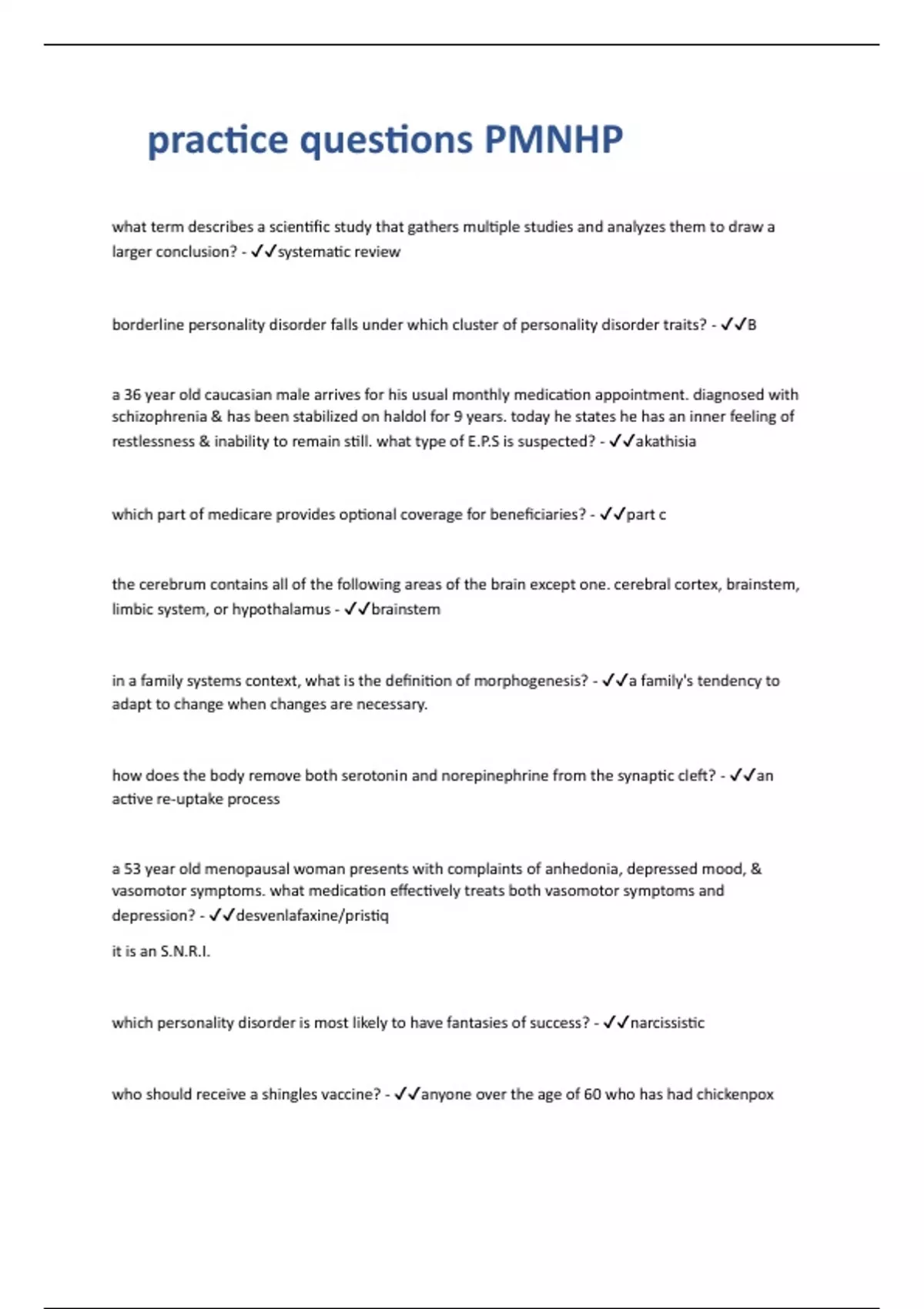 what term describes a scientific study that gathers multiple studies and analyzes them to draw a larger conclusion? - systematic review borderline personality disorder falls under which cluster of personality disorder traits? - B a 36 year old caucasian male arrives for his usual monthly medication appointment. diagnosed with schizophrenia & has been stabilized on haldol for 9 years. today he states he has an inner feeling of restlessness & inability to remain still. what type of E.P.S is suspected? - akathisia which part of medicare provides optional coverage for beneficiaries? - part c the cerebrum contains all of the following areas of the brain except one. cerebral cortex, brainstem, limbic system, or hypothalamus - brainstem in a family systems context, what is the definition of morphogenesis? - a family's tendency to adapt to change when changes are necessary. how does the body remove both serotonin and norepinephrine from the synaptic cleft? - an active re-uptake process a 53 year old menopausal woman presents with complaints of anhedonia, depressed mood, & vasomotor symptoms. what medication effectively treats both vasomotor symptoms and depression? - desvenlafaxine/pristiq it is an S.N.R.I. which personality disorder is most likely to have fantasies of success? - narcissistic who should receive a shingles vaccine? - anyone over the age of 60 who has had chickenpox some states use the umbrella term advanced practice nurse to refer to all of the following except which one? nurse anesthetists, certified nurse midwife, mid-level providers, or nurse practitioners - mid-level providers eating disorders are characterized by what? - disordered patterns of eating, accompanied by distress, disparagement, preoccupation, & a distorted perception of one's body shape the federal government offered financial awards to encourage hospitals to implement meaningful use. the financial awards are tied to specific objectives related to the effective use of electronic health records. give 3 examples of this. - 1. electronic prescribing 2. electronic medication interaction checks 3. computerized provider order entry for an act to be considered criminal, it must have 2 components: actus reus & mens rea. what is actus reus? - voluntary conduct which complementary & alternative medicine technique is based on manipulating the flow of energy throughout the body? - acupuncture who authored the report crossing the quality chasm, which emphasized the need for inter professional collaboration in order to improve the quality of health care? - institute of medicine is a durable power of attorney limited to terminal illness only? - no what term describes a system where the insurer is not only the payer but also the provider of care? - managed care what term best describes a public agency that uses its bargaining power to negotiate competitive prices for health insurance from the private insurance market? - health alliance freud would argue that adults who use 'biting' sarcasm as a defense mechanism are fixated in which psychosexual stage of development? - oral