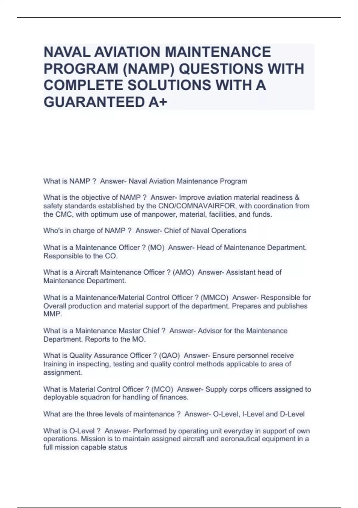NAVAL AVIATION MAINTENANCE PROGRAM (NAMP) QUESTIONS WITH COMPLETE SOLUTIONS WITH A GUARANTEED A+
