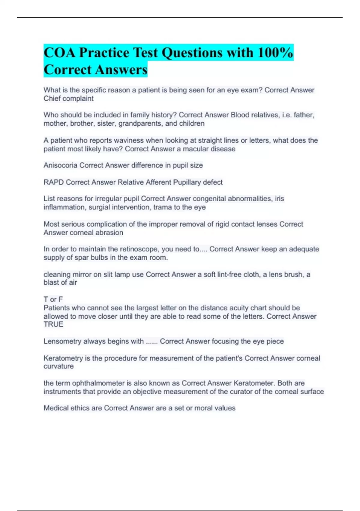 COA Practice Test Questions with 100% Correct Answers