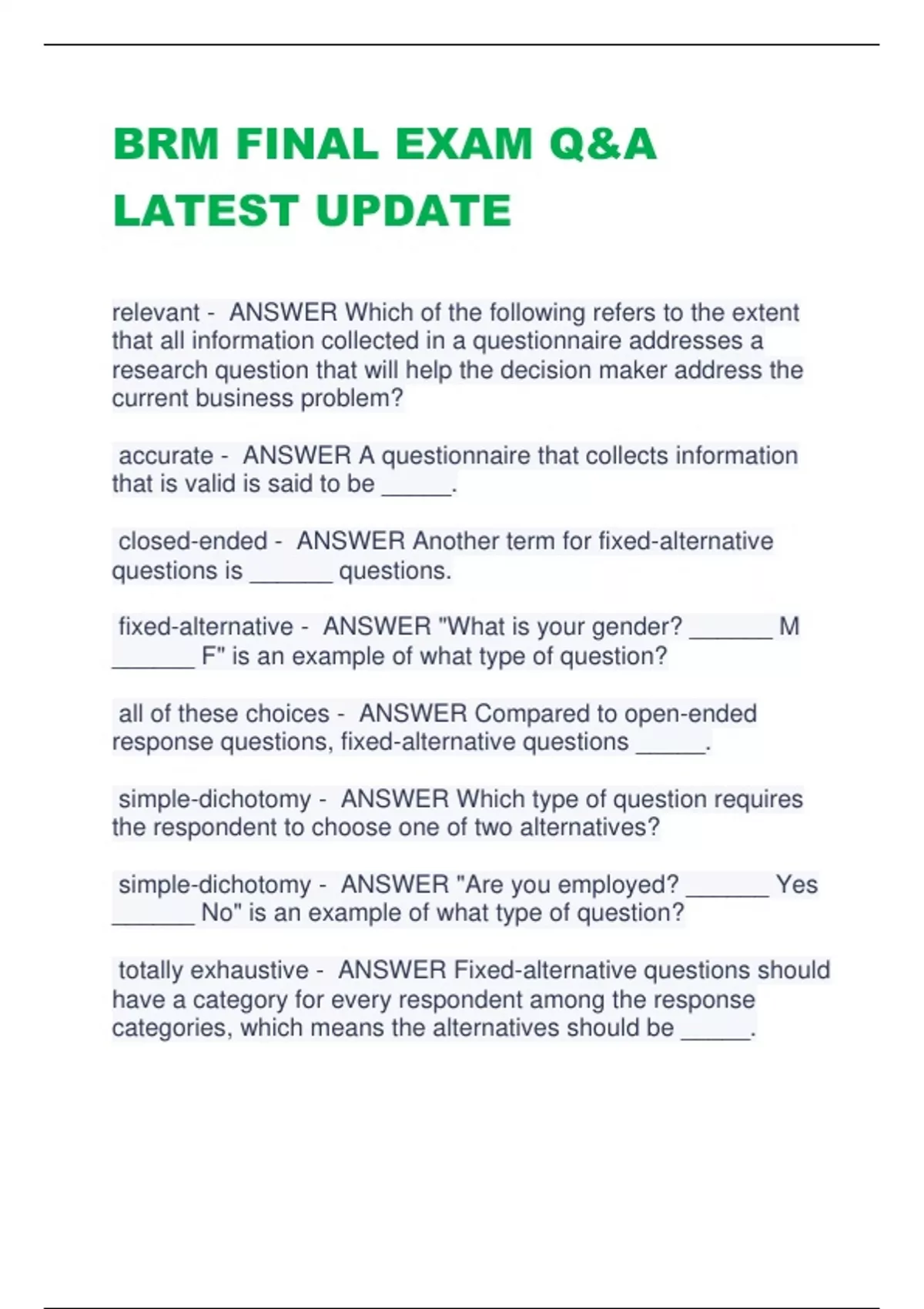 BRM FINAL EXAM Q&A LATEST UPDATE relevant - ANSWER Which of the following refers to the extent that all information collected in a questionnaire addresses a research question that will help the decision maker address the current business problem? accurate - ANSWER A questionnaire that collects information that is valid is said to be _____. closed-ended - ANSWER Another term for fixed-alternative questions is ______ questions. fixed-alternative - ANSWER "What is your gender? ______ M ______ F" is an example of what type of question? all of these choices - ANSWER Compared to open-ended response questions, fixed-alternative questions _____. simple-dichotomy - ANSWER Which type of question requires the respondent to choose one of two alternatives? simple-dichotomy - ANSWER "Are you employed? ______ Yes ______ No" is an example of what type of question? totally exhaustive - ANSWER Fixed-alternative questions should have a category for every respondent among the response categories, which means the alternatives should be _____. mutually exclusive - ANSWER Fixed-alternative questions should not have overlap among response categories, which means the categories should be _____. avoid personal questions - ANSWER All of the following are guidelines that help prevent the most common mistakes in designing questions EXCEPT _____. loaded question - ANSWER Which type of question suggests a socially desirable answer or is emotionally charged? loaded - ANSWER "In light of the current economic crisis, do you agree or disagree that the President of the United States is doing a good job of managing the economy?" is an example of what type of question? double-barreled question - ANSWER A question that may induce bias because it covers more than one issue at once is called a(n) _____. double-barreled - ANSWER "Do you agree or disagree with the statement: The Federal Reserve Bank and the large U.S. banks are responsible for the high foreclosures on home mortgages" is an example of what type of question? unaided recall - ANSWER Asking respondents to remember something without providing any clue is called _____. aided-recall - ANSWER Which format asks a respondent to remember something and gives them a clue to help? order bias - ANSWER Which of the following results when a particular sequencing of questions affects the way a person responds or when the choices provided as answers favors one response over another? order bias - ANSWER In political elections for candidates who are not well-known by many voters, such as judges, it frequently happens that the candidate who is listed first on the ballot receives the most votes, this is an example of a(n) _____. order bias - ANSWER When a respondent in a personal interview is asked questions about shopping at a specific department store in the shopping mall, and then is asked general questions about shopping at that mall, what type of mistake has been made in questionnaire design? census - ANSWER An investigation of all the individual elements that make up a population is called a(n)_____. population - ANSWER Which of the following refers to any complete group whose members share some common set of characteristics?