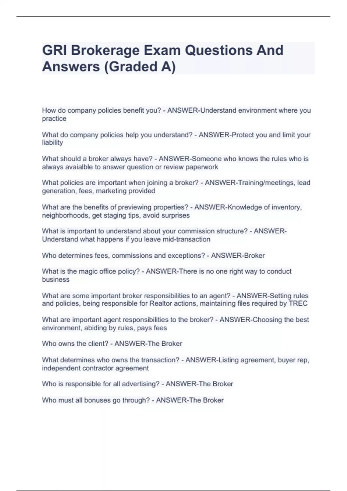 GRI Brokerage Exam Questions And Answers (Graded A) GRI Brokerage Exam Questions And Answers (Graded A) GRI Brokerage Exam Questions And Answers (Graded A) How do company policies benefit you? - ANSWER-Understand environment where you practice What do company policies help you understand? - ANSWER-Protect you and limit your liability What should a broker always have? - ANSWER-Someone who knows the rules who is always avaialble to answer question or review paperwork What policies are important when joining a broker? - ANSWER-Training/meetings, lead generation, fees, marketing provided
