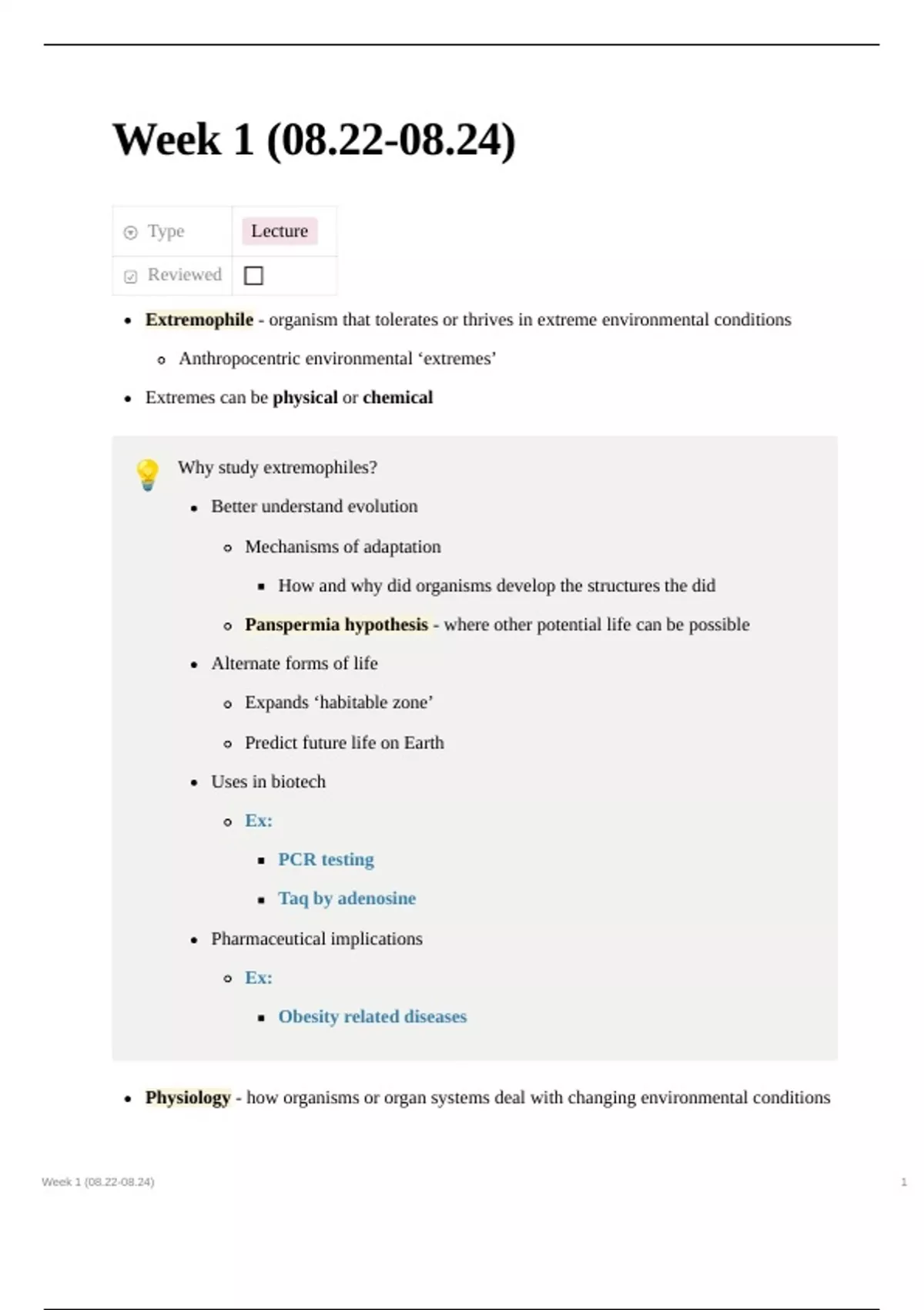 First week of class notes introducing the lesson of extremophiles and what they are.