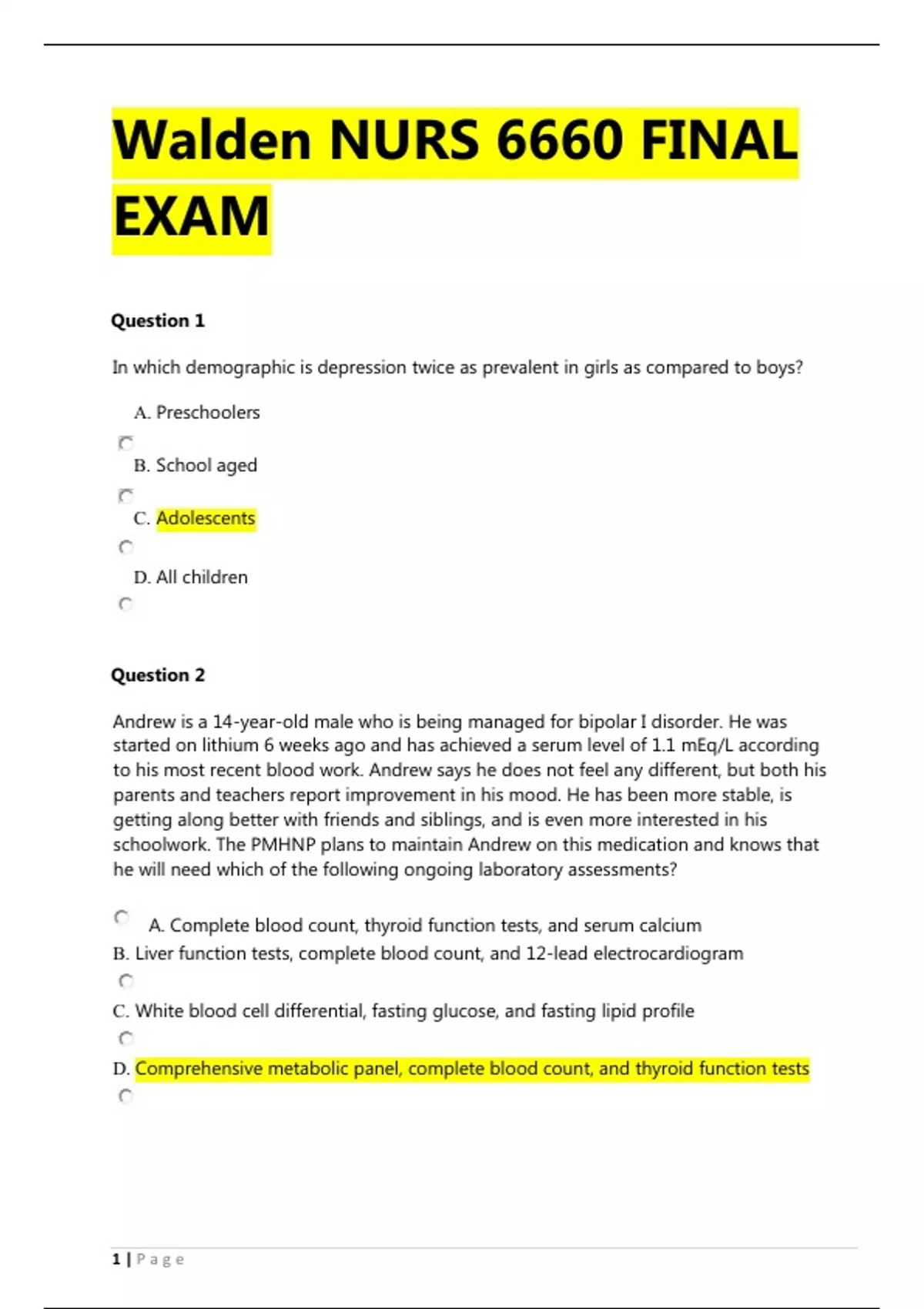 Walden NURS 6660 FINAL EXAMQuestion 1 In which demographic is depression twice as prevalent in girls as compared to boys? A. Preschoolers B. School aged C. Adolescents D. All children Question 2 Andrew is a 14-year-old male who is being managed for bipolar I disorder. He was started on lithium 6 weeks ago and has achieved a serum level of 1.1 mEq/L according to his most recent blood work. Andrew says he does not feel any different, but both his parents and teachers report improvement in his mood. He has been more stable, is getting along better with friends and siblings, and is even more interested in his schoolwork. The PMHNP plans to maintain Andrew on this medication and knows that he will need which of the following ongoing laboratory assessments? A. Complete blood count, thyroid function tests, and serum calcium B. Liver function tests, complete blood count, and 12-lead electrocardiogram C. White blood cell differential, fasting glucose, and fasting lipid profile D. Comprehensive metabolic panel, complete blood count, and thyroid function tests 1 | P a g eQuestion 3 Confidentiality is a complex topic in the world of child and adolescent psychiatry. The last 40 to 50 years have been characterized by increased attention to this issue and the publication of various ethical codes and practice position statements by professional organizations. Which of the following is not a true statement with respect to confidentiality of the child or adolescent client? A. The PMHNP should not be concerned with consent for disclosure when child abuse or maltreatment has occurred. WALDEN UNIVERSITY NURS 6660 FINAL EXAM age B. In 1979, the American Psychiatric Association (APA) stated that children 12 years of or older can give consent for disclosure. C. The American Academy of Child and Adolescent Psychiatry (AACAP) Code of Ethics states that consent is not required for disclosure. D. Regardless of code or position statement by any organization, the best approach is when the child and PMHNP agree on disclosure. Question 4 Debi is a 15-year-old girl who is currently being treated for depression. Her parents have been very proactive and involved in her care, and Debi has achieved remission 2 months after beginning treatment with a combination of pharmacotherapy and cognitive behavioral therapy. While counseling Debi’s parents about important issues in management, the PMHNP advises that: A. There is a > 50% likelihood that Debi’s younger sibling will develop depressive symptoms B. The mean length of major depressive episode in adolescents is 4 monthsC. D. Adolescent-onset depression typically needs long-term pharmacologic management to prevent relapse 20 to 40% of adolescents who have major depressive disorder will develop bipolar I within 5 years Question 5 The therapeutic outcomes for children with disorders of written expression are most favorable when they are characterized by: Concomitant pharmacotherapy with a psychostimulant to promote attention and focus Multimodal therapy to include group interaction with peer-to-peer feedback on writing samples A variety of tutors who will offer a variety of writing techniques, composition strategies, and critiques Intensive, continuous administration of individually tailored, one-on-one expressive and creative writing therapy Question 6 When considering a diagnosis of developmental coordination disorder, the PMHNP knows that the diagnosis may be associated with: A. Above-average scores on performance subtests of standardized intelligence testing B. Below-average scores on verbal subtests of standardized intelligence testing 3 | P a g eC. Soft neurologic signs on physical examination such as slight reflex abnormalities D. Physical findings consistent with neuromuscular disease such as muscular dystrophy Question 7 Caylee is a 5-year-old girl who is referred for evaluation by child protective services. She was recently removed from her biological family and placed in foster care, as her home environment was reportedly unsafe due to conditions of extreme neglect. Her foster mother reports that Caylee is very quiet and withdrawn and always appears sad and disinterested in her surroundings; however, she becomes very irritable when anything unexpected or unplanned occurs. The foster mother became very concerned when it appeared that Caylee was hallucinating. The PMHNP considers that: A. Caylee is at high risk for suicide and precautions should be taken B. C. The hallucinations are consistent with brief psychotic disorder or schizophrenia The history and reported symptoms are typical of depressive disorder in young children D. This is a common situation when prepubertal children are removed from the biological parents regardless of how dysfunctional they are Question 8 Children with gender dysphoria typically have higher rates of all the following except: A. Depression B. Impulse control disorders C. Anxiety disordersD. Eating disorder Question 9 Eileen is a 23-month-old girl who is being evaluated for autism spectrum disorder because her pediatrician is concerned about the presence of developmental red flags. She has just a few words of speech and has not put together any meaningful two-word phrases. While taking a history from Eileen’s mother the PMHNP learns that for approximately the last 2 months Eileen has been seen eating paint chips that are peeling off the baseboard and window sills in the family home; when she sees one she puts it in her mouth. This is a concern because they live in an old farmhouse and there may be lead-based paint in some of the paint layers. The PMHNP considers that which of the following is not consistent with a diagnosis of pica? A. A diagnosis of autism spectrum disorder B. Symptoms < 6 months duration C. The pattern of eating D. Lack of potential consequences Question 10 The current scholarly consensus is that the etiology of bulimia nervosa is multifactorial to include biological, sociocultural, family, cognitive-behavioral, and