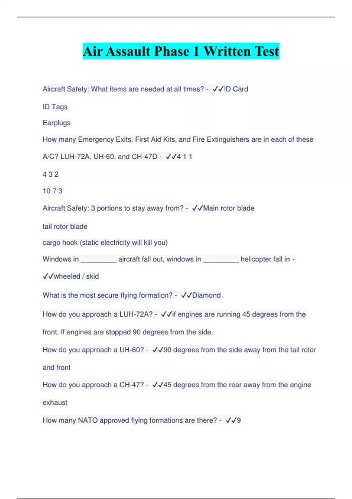 Air Assault Phase 1 Written Test Aircraft Safety: What items are needed at all times? -️️ ID Card ID Tags Earplugs How many Emergency Exits, First Aid Kits, and Fire Extinguishers are in each of these A/C? LUH-72A, UH-60, and CH-47D -️️ 4 1 1 4 3 2 10 7 3 Aircraft Safety: 3 portions to stay away from? -️️ Main rotor blade tail rotor blade cargo hook (static electricity will kill you) Windows in _________ aircraft fall out, windows in _________ helicopter fall in -️️ wheeled / skid What is the most secure flying formation? -️️ Diamond How do you approach a LUH-72A? -️️ if engines are running 45 degrees from the front. If engines are stopped 90 degrees from