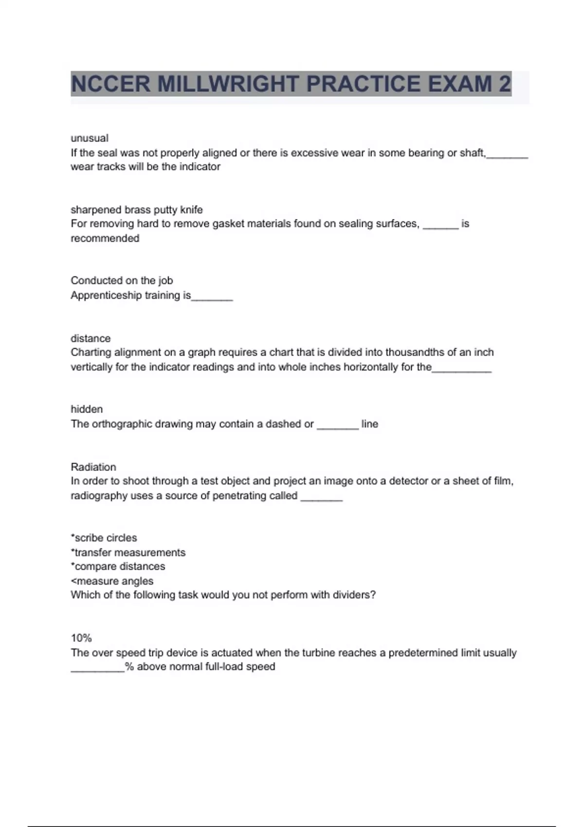 NCCER MILLWRIGHT PRACTICE EXAM 2 QUESTIONS AND ANSWERS 100% ACCURATE 2023 /2024 COMPLETE SOLUTION unusual If the seal was not properly aligned or there is excessive wear in some bearing or shaft,_______ wear tracks will be the indicator sharpened brass putty knife For removing hard to remove gasket materials found on sealing surfaces, ______ is recommended Conducted on the job Apprenticeship training is_______