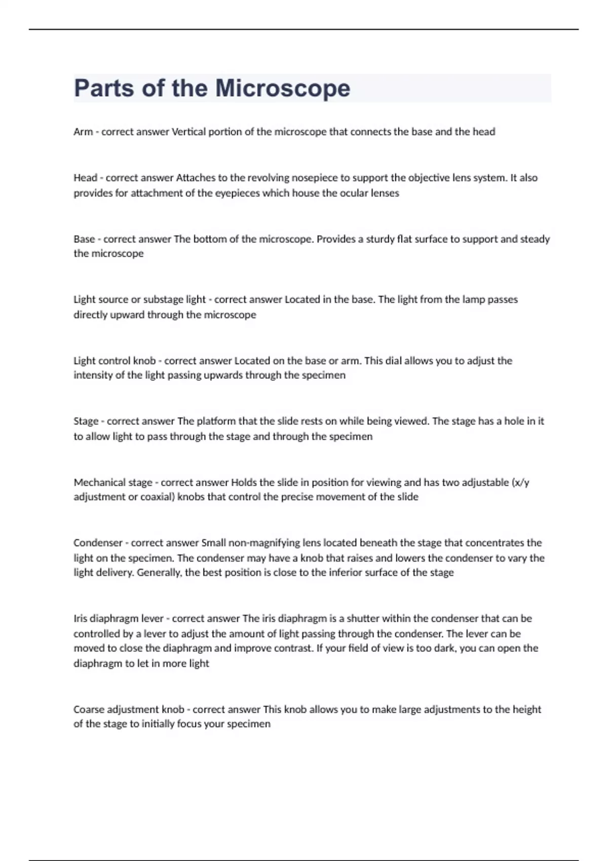 Parts of the MicroscopeArm - correct answer Vertical portion of the microscope that connects the base and the head Head - correct answer Attaches to the revolving nosepiece to support the objective lens system. It also provides for attachment of the eyepieces which house the ocular lenses Base - correct answer The bottom of the microscope. Provides a sturdy flat surface to support and steady the microscope Light source or substage light - correct answer Located in the base. The light from the lamp passes directly upward through the microscope Light control knob - correct answer Located on the base or arm. This dial allows you to adjust the intensity of the light passing upwards through the specimen Stage - correct answer The platform that the slide rests on while being viewed. The stage has a hole in it to allow light to pass through the stage and through the specimen Mechanical stage - correct answer Holds the slide in position for viewing and has two adjustable (x/y adjustment or coaxial) knobs that control the precise movement of the slide Condenser - correct answer Small non-magnifying lens located beneath the stage that concentrates the light on the specimen. The condenser may have a knob that raises and lowers the condenser to vary the light delivery. Generally, the best position is close to the inferior surface of the stage Iris diaphragm lever - correct answer The iris diaphragm is a shutter within the condenser that can be controlled by a lever to adjust the amount of light passing through the condenser. The lever can be moved to close the diaphragm and improve contrast. If your field of view is too dark, you can open the diaphragm to let in more light Coarse adjustment knob - correct answer This knob allows you to make large adjustments to the height of the stage to initially focus your specimen Fine adjustment knob - correct answer This knob is used for precise focusing once the initial coarse focusing has been completed Nosepiece - correct answer Rotating mechanism connected to the head. Generally, it carries three or four objective lenses and permits positioning of these lenses over the hole in the stage Objective lenses - correct answer These lenses are attached to the nosepiece. Usually, a compound microscope has four objective lens: scanning (4x), low-power (10x), high-power (40x), and oil immersion (100x). Typical magnifying powers for the objectives are listed in parentheses Ocular lenses - correct answer Binocular microscopes will have two lenses located in the eyepieces as the superior end of the head. Most ocular lenses have a magnification power of 10x. Some microscopes will have a pointer and / or reticle (micrometer) which can be positioned by rotating the ocular lens Stage opening - correct answer Allows light upwards toward the specimen for better viewing via the condenser Stage lock control - correct answer Allows stage to be locked in a single position Slide holder - correct answer Holds the slide in place for viewing the specimen Graduated locator markings - correct answer Positioned on the mechanical portion of the stage allow the microscopist to note the location of important specimen details, allowing easy return to the area for additional observation or photomicrography X-Y transitional knobs - correct answer Moves the stage forward & backwards and up & down Diopter adjustment - correct answer Useful as a means to change focus on one eyepiece so as to correct for any difference in vision between your two eyes