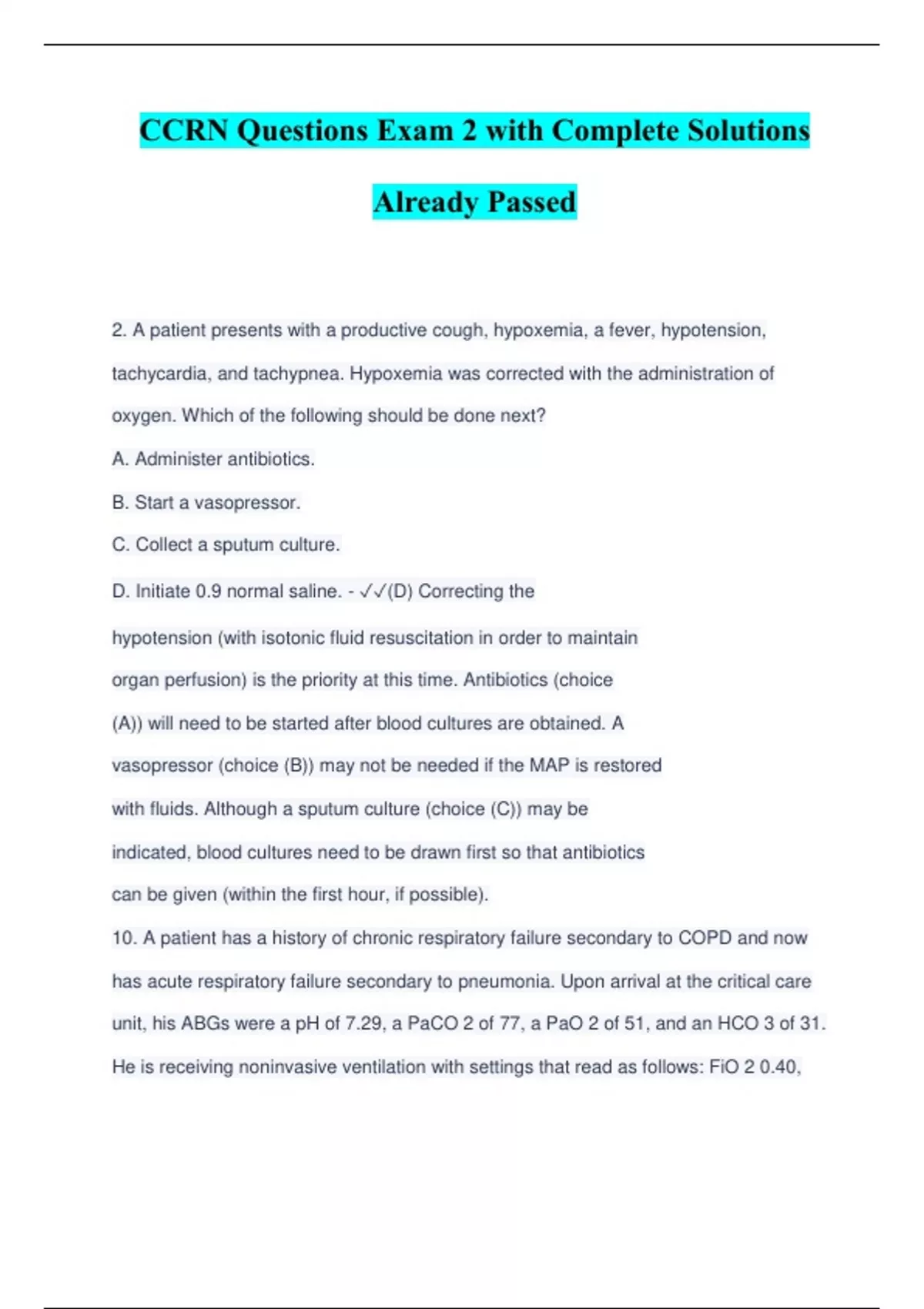 CCRN Questions Exam 2 with Complete Solutions Already Passed 2. A patient presents with a productive cough, hypoxemia, a fever, hypotension, tachycardia, and tachypnea. Hypoxemia was corrected with the administration of oxygen. Which of the following should be done next? A. Administer antibiotics. B. Start a vasopressor. C. Collect a sputum culture. D. Initiate 0.9 normal saline. - (D) Correcting the hypotension (with isotonic fluid resuscitation in order to maintain organ perfusion) is the priority at this time. Antibiotics (choice (A)) will need to be started after blood cultures are obtained. A vasopressor (choice (B)) may not be needed if the MAP is restored with fluids. Although a sputum culture (choice (C)) may be indicated, blood cultures need to be drawn first so that antibiotics can be given (within the first hour, if possible). 10. A patient has a history of chronic respiratory failure secondary to COPD and now has acute respiratory failure secondary to pneumonia. Upon arrival at the critical care unit, his ABGs were a pH of 7.29, a PaCO 2