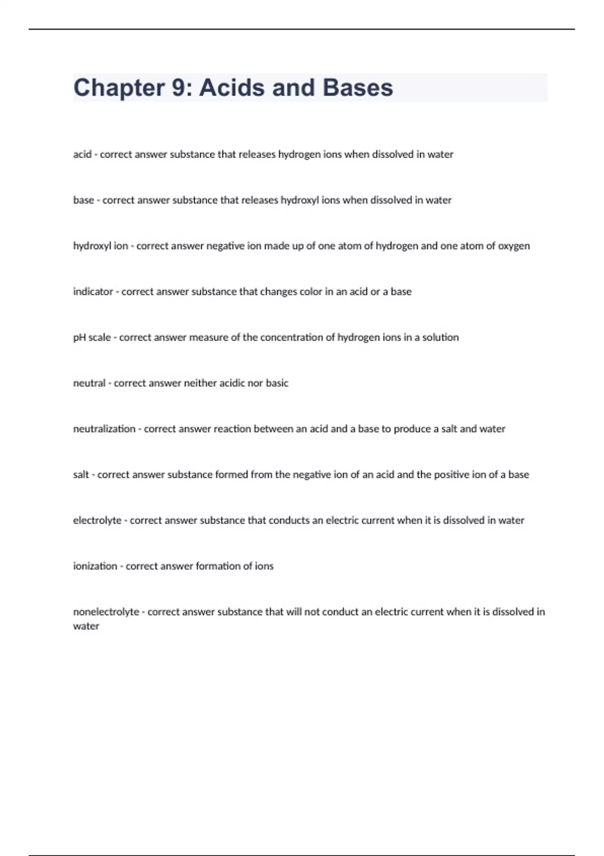 Chapter 9 Acids and Basesacid - correct answer substance that releases hydrogen ions when dissolved in water base - correct answer substance that releases hydroxyl ions when dissolved in water hydroxyl ion - correct answer negative ion made up of one atom of hydrogen and one atom of oxygen indicator - correct answer substance that changes color in an acid or a base pH scale - correct answer measure of the concentration of hydrogen ions in a solution neutral - correct answer neither acidic nor basic neutralization - correct answer reaction between an acid and a base to produce a salt and water salt - correct answer substance formed from the negative ion of an acid and the positive ion of a base electrolyte - correct answer substance that conducts an electric current when it is dissolved in water ionization - correct answer formation of ions nonelectrolyte - correct answer substance that will not conduct an electric current when it is dissolved in water