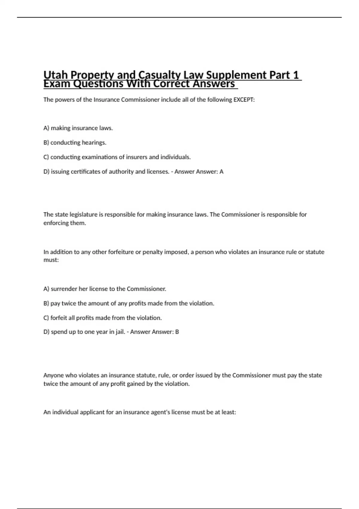 Utah Property and Casualty Law Supplement Part 1 Exam Questions With Correct Answers