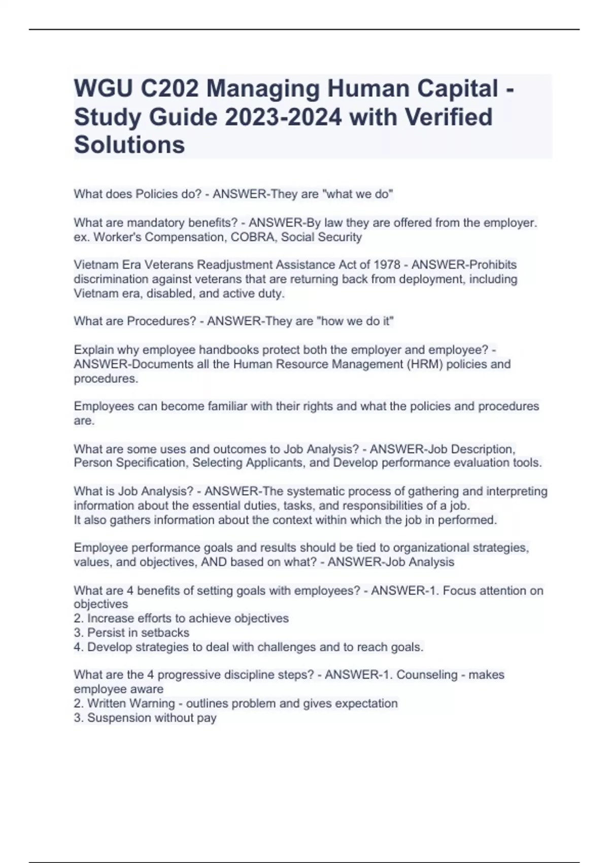 What does Policies do? - ANSWER-They are "what we do" What are mandatory benefits? - ANSWER-By law they are offered from the employer. ex. Worker's Compensation, COBRA, Social Security Vietnam Era Veterans Readjustment Assistance Act of 1978 - ANSWER-Prohibits discrimination against veterans that are returning back from deployment, including Vietnam era, disabled, and active duty. What are Procedures? - ANSWER-They are "how we do it" Explain why employee handbooks protect both the employer and employee? - ANSWER-Documents all the Human Resource Management (HRM) policies and procedures. Employees can become familiar with their rights and what the policies and procedures are. What are some uses and outcomes to Job Analysis? - ANSWER-Job Description, Person Specification, Selecting Applicants, and Develop performance evaluation tools. What is Job Analysis? - ANSWER-The systematic process of gathering and interpreting information about the essential duties, tasks, and responsibilities of a job. It also gathers information about the context within which the job in performed. Employee performance goals and results should be tied to organizational strategies, values, and objectives, AND based on what? - ANSWER-Job Analysis What are 4 benefits of setting goals with employees? - ANSWER-1. Focus attention on objectives 2. Increase efforts to achieve objectives 3. Persist in setbacks 4. Develop strategies to deal with challenges and to reach goals. What are the 4 progressive discipline steps? - ANSWER-1. Counseling - makes employee aware 2. Written Warning - outlines problem and gives expectation 3. Suspension without pay
