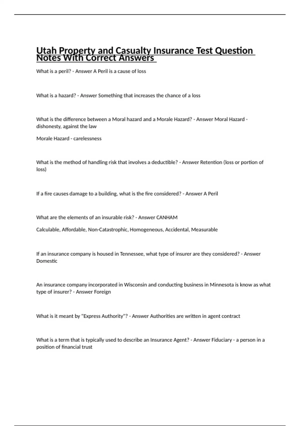 Utah Property and Casualty Insurance Test Question Notes With Correct Answers