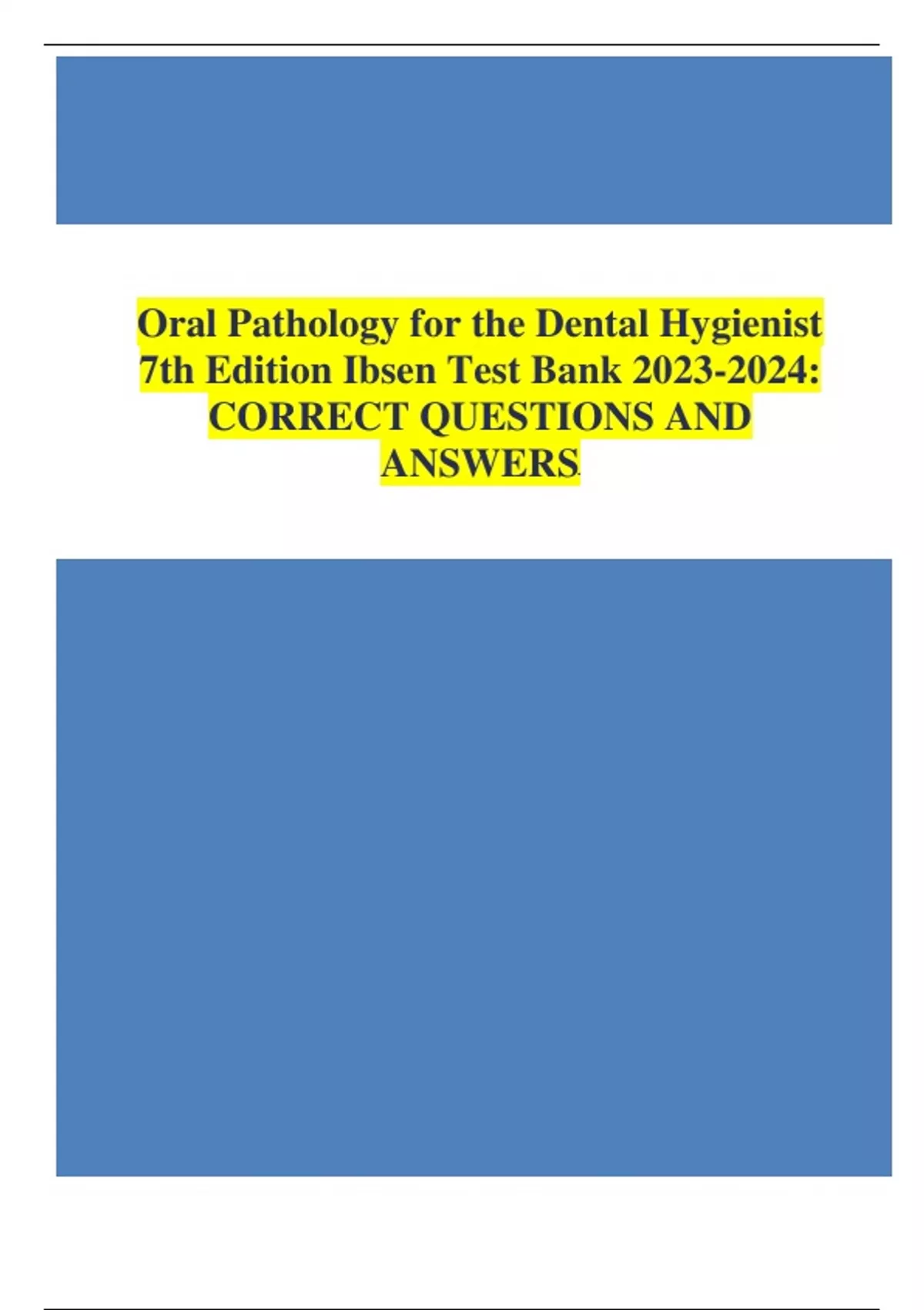 Oral Pathology for the Dental Hygienist 7th Edition Ibsen Test Bank Instant delivery (Printed PDF) To clarify, this is not a TEXTBOOK! This is a Test Bank (Study Questions) to help you better prepare for your exams. Test Bank Directly From The publisher, 100% Verified Answers. COVERS ALL CHAPTERS....