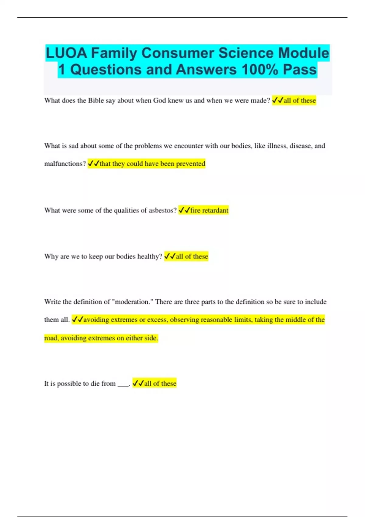 LUOA Family Consumer Science Module 1 Questions and Answers 100% Pass