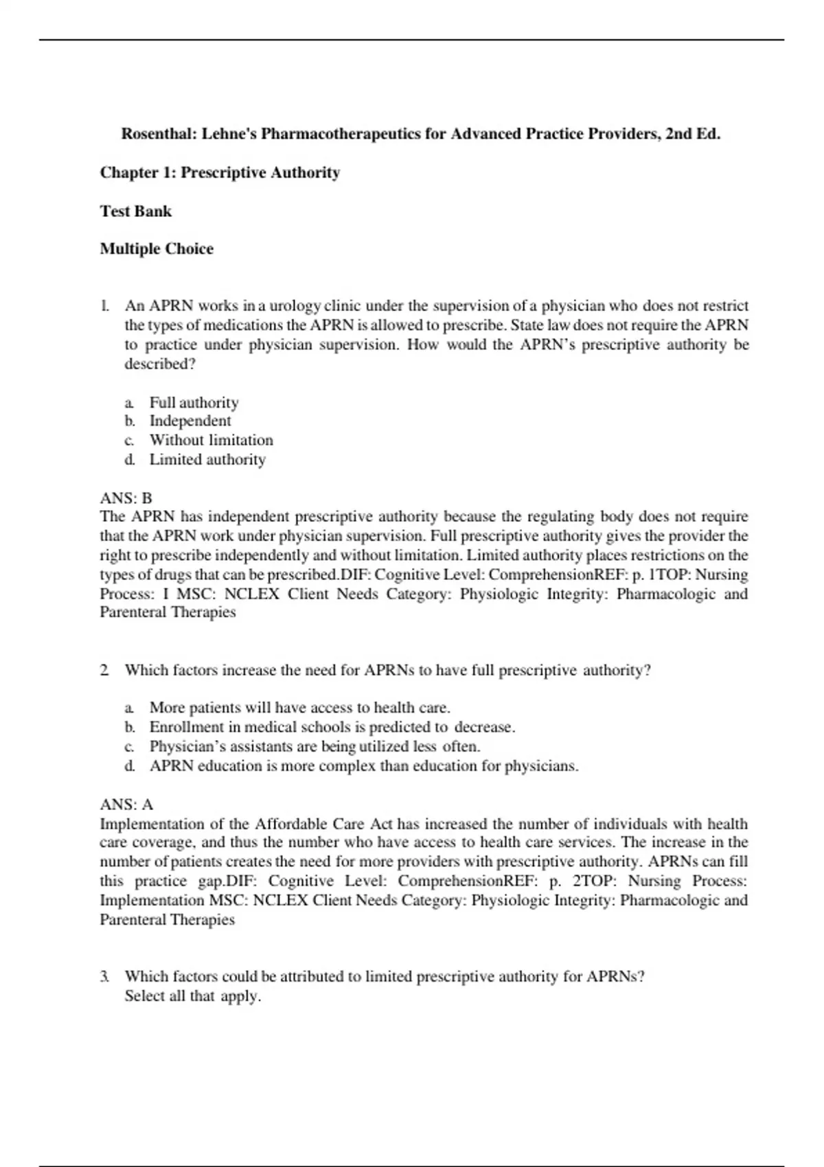 Rosenthal: Lehne's Pharmacotherapeutics for Advanced Practice Providers, 2nd Ed. Test Bank Lehne’s Pharmacotherapeutics for Advanced Practice Nurses and Physician Assistants 2nd Edition Rosenthal , Test Bank, Chapter 1-92, Secure HIGHSCORE Test Bank Lehne’s Pharmacotherapeutics for Advanced Practice Nurses and Physician Assistants 2nd Edition Rosenthal | Test Bank| Chapter 1-92| Complete Guide A+ Test Bank Pharmacotherapeutics for Advanced Practice Nurses and Physician Assistants 2nd Edition Rosenthal Chapter 1 Prescriptive Authority Chapter 2 Rational Drug Selection and Prescription Writing Chapter 3 Promoting Positive Outcomes of Drug Therapy Chapter 4 Pharmacokinetics, Pharmacodynamics, and Drug Interactions Chapter 5 Adverse Drug Reactions and Medication Errors Chapter 6 Individual Variation in Drug Responses Chapter 7 Genetic and Genomic Considerations in Pharmacotherapeutics Chapter 8 Drug Therapy During Pregnancy and Breast-Feeding Chapter 9 Drug Therapy in Pediatric Patients Chapter 10 Drug Therapy in Geriatric Patients Chapter 11 Basic Principles of Neuropharmacology Chapter 12 Physiology of the Peripheral Nervous System Chapter 13 Muscarinic Agonists Chapter 14 Muscarinic Antagonists Chapter 15 Adrenergic Agonists Chapter 16 Adrenergic Antagonists Chapter 17 Indirect-Acting Antiadrenergic Agents Chapter 18 Introduction to Central Nervous System Pharmacology Chapter 19 Drugs for Parkinson Disease Chapter 20 Drugs for Alzheimer Disease Chapter 21 Drugs for Seizure Disorders Chapter 22 Drugs for Muscle Spasm and Spasticity Chapter 23 Local Anesthetics Chapter 24 Opioid Analgesics, Opioid Antagonists, and Nonopioid Centrally Acting Analgesics Chapter 25 Drugs for Headache Chapter 26 Antipsychotic Agents and Their Use in Schizophrenia Chapter 27 Antidepressants Chapter 28 Drugs for Bipolar Disorder Chapter 29 Sedative-Hypnotic Drugs Chapter 30 Management of Anxiety Disorders Chapter 31 Central Nervous System Stimulants and Attention-Deficit/Hyperactivity Disorder Chapter 32 Substance Use Disorders I: Basic Considerations Chapter 33 Substance Use Disorders II: Alcohol Chapter 34 Substance Use Disorders III: Nicotine and Smoking Chapter 35 Substance Use Disorders IV: Major Drugs of Abuse Other Than Alcohol and Nicotine Chapter 36 Review of Hemodynamics 37. Diuretics 38. Drugs Acting on the Renin-Angiotensin-Aldosterone System Chapter 39 Calcium Channel Blockers Chapter 40 Vasodilators Chapter 41 Drugs for Hypertension Chapter 42 Drugs for Heart Failure Chapter 43 Antidysrhythmic Drugs Chapter 44 Prophylaxis Atherosclerotic Cardiovascular Disease: Drugs Cholesterol TriglycerideLevels Chapter 45 Drugs for Angina Pectoris Chapter 46 Anticoagulant, Antiplatelet, and Thrombolytic Drugs Chapter 47 Drugs for Deficiency Anemias Chapter 48 Drugs for Diabetes Mellitus Chapter 49 Drugs for Thyroid Disorders Chapter 50 Estrogens and Progestins: Basic Pharmacology and Noncontraceptive Applications Chapter 51 Birth Control Chapter 52 Androgens Chapter 53 Drugs for Erectile Dysfunction and Benign Prostatic Hyperplasia Chapter 54 Review of the Immune System Chapter 55 Childhood Immunization Chapter 56 Antihistamines Chapter 57 Cyclooxygenase Inhibitors: Nonsteroidal Anti-inflammatory Drugs and Acetaminophen Chapter 58 Glucocorticoids in Nonendocrine Disorders 59. Drug Therapy of Rheumatoid Arthritis Chapter 60 Drug Therapy of Gout 61. Drugs Affecting CalciumLevels and Bone Mineralization Chapter 62 Drugs for Asthma and Chronic Obstructive Pulmonary Disease Chapter 63 Drugs for Allergic Rhinitis, Cough, and Colds Chapter 64 Drugs for Peptic Ulcer Disease Chapter 65 Laxatives Chapter 66 Other Gastrointestinal Drugs Chapter 67 Vitamins Chapter 68 Drugs for Weight Loss Chapter 69 Complementary and Alternative Therapies Chapter 70 Basic Principles of Antimicrobial Therapy Chapter 71 Drugsthat Weaken the Bacterial Cell Wall I: Penicillins Chapter 72 Drugsthat Weaken the Bacterial Cell Wall II: Other Drugs Chapter 73 Bacteriostatic Inhibitors of Protein Synthesis Chapter 74 Aminoglycosides: Bactericidal Inhibitors of Protein Synthesis Chapter 75 Sulfonamides and Trimethoprim Chapter 76 Drug Therapy of Urinary Tract Infections Chapter 77 Drugs Therapy for Tuberculosis Chapter 78 Miscellaneous Antibacterial Drugs Chapter 79 Antifungal Agents 80. Antiviral Agents I: Drugs for Non-HIV Viral Infections Chapter 81 Antiviral Agents II: Drugs for HIV Infection and Related Opportunistic Infections Chapter 82 Drug Therapy of Sexually Transmitted Diseases Chapter 83 Anthelmintics, Antiprotozoal Drugs, and Ectoparasiticides Chapter 84 Introduction to Immunomodulators Chapter 85 Supportive Care of Patients Receiving Anticancer Drugs Chapter 86 Drugs for Cancer Pain Chapter 87 Drugs for the Eye Chapter 88 Drugs for the Skin Chapter 89 Drugs for the Ear Chapter 90 Agents Affecting the Volume and Ion Content of Body Fluids Chapter 91 Management of ST-Elevation Myocardial Infarction Chapter 92 Additional Acute Care Drugs Chapter 1: Prescriptive Authority Test Bank Multiple Choice 1. An APRN works in a urology clinic under the supervision of a physician who does not restrict the types of medications the APRN is allowed to prescribe. State law does not require the APRN to practice under physician supervision. How would the APRN’s prescriptive authority be described? a. Full authority b. Independent c. Without limitation d. Limited authority ANS: B The APRN has independent prescriptive authority because the regulating body does not requirethat the APRN work under physician supervision. Full prescriptive authority gives the provider the right to prescribe independently and without limitation. Limited authority places restrictions on the types of drugsthat can be prescribed.DIF: CognitiveLevel: ComprehensionREF: p. 1TOP: Nursing Process: IMSC: NCLEX Client Needs Category: Physiologic Integrity: Pharmacologic and Parenteral Therapies 2. Which factors increase the need for APRNs to have full prescriptive authority? a. More p