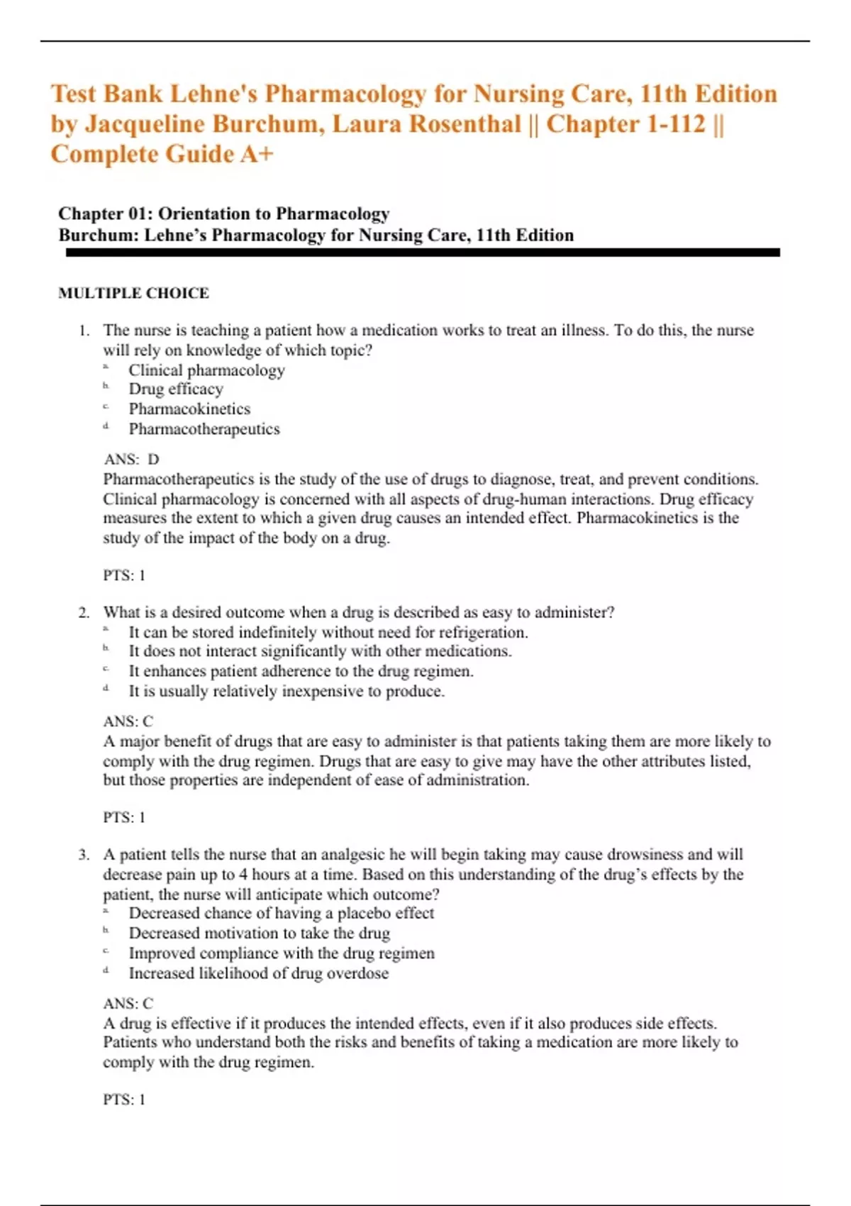 Test Bank Lehne's Pharmacology for Nursing Care, 11th Edition by Jacqueline Burchum, Laura Rosenthal || Chapter 1-112 || Complete Guide A+Test Bank Lehne's Pharmacology for Nursing Care, 11th Edition by Jacqueline Burchum, Laura Rosenthal Chapter 1-112 Complete Guide A+ Chapter 01: Orientation to Pharmacology Burchum: Lehne’s Pharmacology for Nursing Care, 11th Edition MULTIPLE CHOICE 1. The nurse is teaching a patient how a medication works to treat an illness. To do this, the nurse will rely on knowledge of which topic? a. Clinical pharmacology b. Drug efficacy c. Pharmacokinetics d. Pharmacotherapeutics ANS: D Pharmacotherapeutics is the study of the use of drugs to diagnose, treat, and prevent conditions. Clinical pharmacology is concerned with all aspects of drug-human interactions. Drug efficacy measures the extent to which a given drug causes an intended effect. Pharmacokinetics is the study of the impact of the body on a drug. PTS: 1 2. What is a desired outcome when a drug is described as easy to administer? a. It can be stored indefinitely without need for refrigeration. b. It does not interact significantly with other medications. c. It enhances patient adherence to the drug regimen. d. It is usually relatively inexpensive to produce. ANS: C A major benefit of drugs that are easy to administer is that patients taking them are more likely to comply with the drug regimen. Drugs that are easy to give may have the other attributes listed, but those properties are independent of ease of administration. PTS: 1 3. A patient tells the nurse that an analgesic he will begin taking may cause drowsiness and will decrease pain up to 4 hours at a time. Based on this understanding of the drug’s effects by the patient, the nurse will anticipate which outcome? a. Decreased chance of having a placebo effect b. Decreased motivation to take the drug c. Improved compliance with the drug regimen d. Increased likelihood of drug overdose ANS: C A drug is effective if it produces the intended effects, even if it also produces side effects. Patients who understand both the risks and benefits of taking a medication are more likely to comply with the drug regimen. PTS: 1 S - The Marketplace to Buy and Sell your Study Material Downloaded by: michcap | Distribution of this document is illegal Want to earn $103 per month? Downloaded by Thomas Mboya () lOMoARcPSD| S - The Marketplace to Buy and Sell your Study Material MULTIPLE RESPONSE 1. What are considered the ‘Big Three’ properties of an ideal drug? (Select all that apply.) a. Irreversible action b. Effectiveness c. Safety d. Selectivity e. A recognizable trade name ANS: B, C, D The ‘Big Three’ properties of the ideal drug are effectiveness, safety, and selectivity. PTS: 1 2. Before administering a medication, what does the nurse need to know to evaluate how individual patient variability might affect the patient’s response to the medication? (Select all that apply.) a. Chemical stability of the medication b. Ease of administration c. Family medical history d. Patient’s age e. Patient’s diagnosis ANS: C, D, E The family medical history can indicate genetic factors that may affect a patient’s response to a medication. Patients of different ages can respond differently to medications. The patient’s illness can affect how drugs are metabolized. The chemical stability of the medication and the ease of administration are properties of drugs. PTS: 1 Chapter 02: Application of Pharmacology in Nursing Practice Burchum: Lehne’s Pharmacology for Nursing Care, 11th Edition MULTIPLE CHOICE 1. A patient is using a metered-dose inhaler containing albuterol for asthma. The medication label instructs the patient to administer “2 puffs every 4 hours as needed for coughing or wheezing.” The patient reports feeling jittery sometimes when taking the medication, and doesn’t feel that the medication is always effective. Which action is outside the nurse’s scope of practice? a. Asking the patient to demonstrate the use of the inhaler b. Assessing the patient’s exposure to tobacco smoke c. Auscultating lung sounds and obtaining vital signs d. Suggesting that the patient use 1 puff to reduce side effects ANS: D S - The Marketplace to Buy and Sell your Study Material Downloaded by: michcap | Distribution of this document is illegal Want to earn $103 per month? Downloaded by Thomas Mboya () lOMoARcPSD| S - The Marketplace to Buy and Sell your Study Material It is not within the nurse’s scope of practice to change the dose of a medication without an order from a prescriber. Asking the patient to demonstrate inhaler use helps the nurse to evaluate the patient’s ability to administer the medication properly and is part of the nurse’s evaluation. Assessing tobacco smoke exposure helps the nurse determine whether nondrug therapies, such a smoke avoidance, can be used as an adjunct to drug therapy. Performing a physical assessment helps the nurse evaluate the patient’s response to the medication. PTS: 1 2. A postoperative patient is being discharged home with acetaminophen/hydrocodone [Norco] for pain. The patient asks the nurse about using Tylenol for fever. Which statement by the nurse is correct? a. “It is not safe to take over-the-counter drugs with prescription medications.” b. “Taking the two medications together poses a risk of drug toxicity.” c. “There are no known drug interactions, so this will be safe.” d. “Tylenol and Norco are different drugs, so there is no risk of overdose.” ANS: B Tylenol is the trade name and acetaminophen is the generic name for the same medication. It is important to teach patients to be aware of the different names for the same drug to minimize the risk of overdose. Over-the-counter (OTC) medications and prescription medications may be taken together unless significant harmful drug interactions are possible. Even though no drug interactions are at play in this case, both drugs contain acetamin