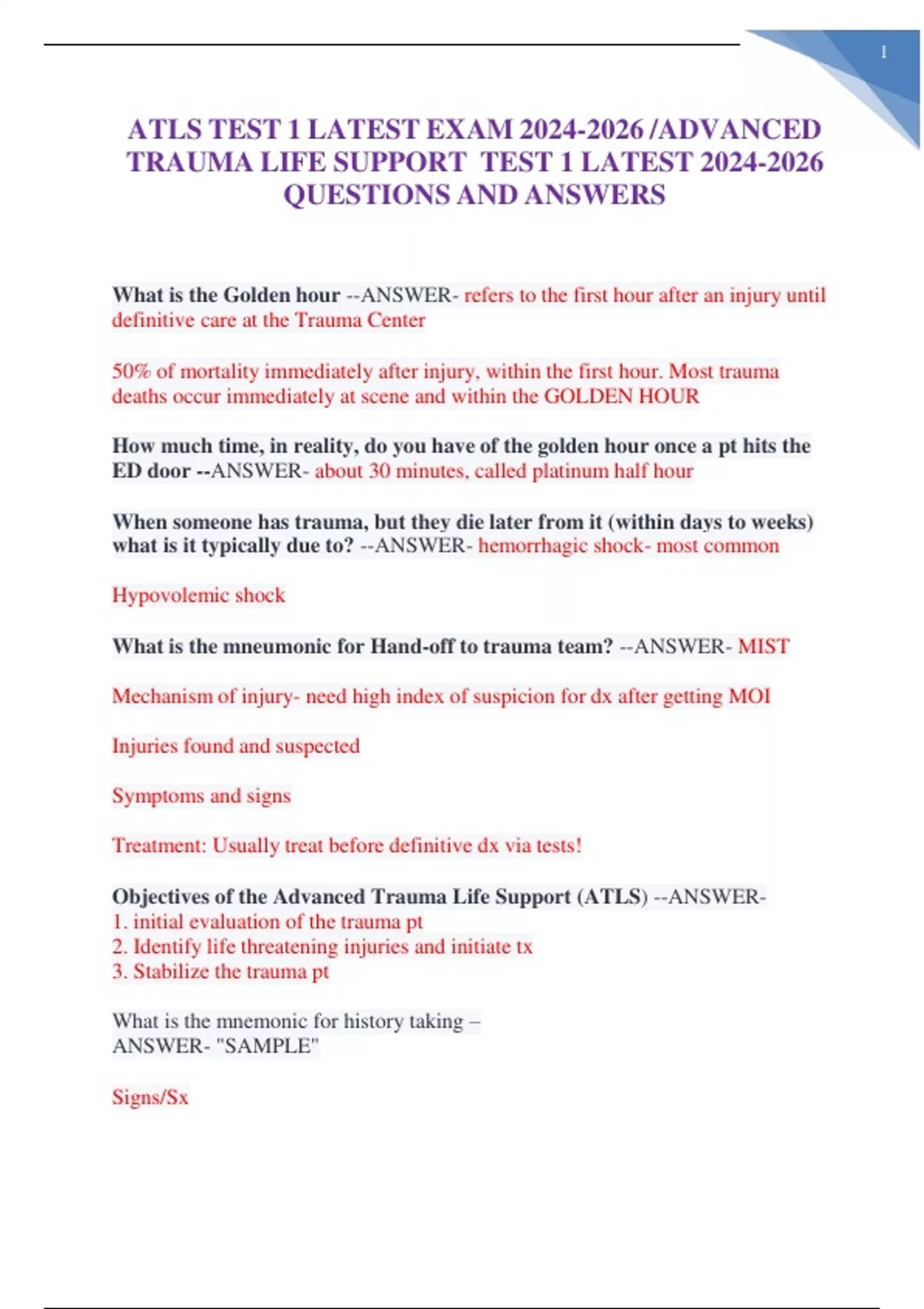 ATLS TEST 1 LATEST EXAM /ADVANCED TRAUMA LIFE SUPPORT TEST 1 LATEST QUESTIONS AND ANSWERS/ATLS TEST 1 LATEST EXAM /ADVANCED TRAUMA LIFE SUPPORT TEST 1 LATEST QUESTIONS AND ANSWERS/ATLS TEST 1 LATEST EXAM /ADVANCED TRAUMA LIFE SUPPORT TEST 1 LATEST QUESTIONS AND ANSWERS