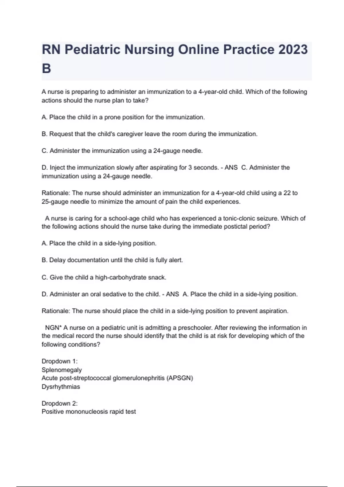 RN Pediatric Nursing Online Practice 2023 B A nurse is preparing to administer an immunization to a 4-year-old child. Which of the following actions should the nurse plan to take? A. Place the child in a prone position for the immunization. B. Request that the child's caregiver leave the room during the immunization. C. Administer the immunization using a 24-gauge needle. D. Inject the immunization slowly after aspirating for 3 seconds. - ANS C. Administer the immunization using a 24-gauge needle. Rationale: The nurse should administer an immunization for a 4-year-old child using a 22 to 25-gauge needle to minimize the amount of pain the child experiences. A nurse is caring for a school-age child who has experienced a tonic-clonic seizure. Which of the following actions should the nurse take during the immediate postictal period? A. Place the child in a side-lying position. B. Delay documentation until the child is fully alert. C. Give the child a high-carbohydrate snack. D. Administer an oral sedative to the child. - ANS A. Place the child in a side-lying position. Rationale: The nurse should place the child in a side-lying position to prevent aspiration. NGN* A nurse on a pediatric unit is admitting a preschooler. After reviewing the information in the medical record the nurse should identify that the child is at risk for developing which of the following conditions? Dropdown 1: Splenomegaly Acute post-streptococcal glomerulonephritis (APSGN) Dysrhythmias Dropdown 2: Positive mononucleosis rapid test Urinary output Cardiovascular assessment - ANS 1. Splenomegaly Rationale: The child's positive mononucleosis rapid test result indicates the presence of infectious mono, a condition caused by the Epstein-Barr virus. Therefore, the nurse should identify that the child is at risk for developing splenomegaly, a common complication of infectious mono. 2. Positive mono rapid test Rationale: The child's positive mononucleosis rapid test result indicates the presence of infectious mono, a condition caused by the Epstein-Barr virus. Therefore, the nurse should identify that the child is at risk for developing splenomegaly, a common complication of infectious mono. A nurse is assessing an infant who has a ventricular septal defect. Which of the following findings should the nurse expect? A. Loud, harsh murmur B. Dysrhythmias C. Weak femoral pulses D. High blood pressure - ANS A. Loud, harsh murmur Rationale: The nurse should expect to hear a loud, harsh murmur with a ventricular septal defect due to the left-to-right shunting of blood, which contributes to hypertrophy of the infant's heart muscle. A nurse is providing discharge teaching the guardians of a toddler with a lower leg cast applied 24 hours ago. The nurse should instruct the guardians to report which of the following findings to the provider? A. Capillary refill time < 2 seconds. B. Restricted ability to move the toes. C. Swelling of the casted foot when the leg is dependent. D. Pedal pulse +3 bilateral. - ANS B. Restricted ability to move the toes. Rationale: The nurse should inform the guardians that the restricted ability of the toddler to move their toes is an indication of neuromuscular compromise and requires immediate notification to the provider. Permanent muscle and tissue damage can occur in just a few hours. A nurse is planning an educational program to teach caregivers about protecting their children from sunburns. Which of the following instructions should the nurse plan to include? A. "Allow your child to play outside during the hours between 10:00 am and 2:00 pm." B. "Choose a waterproof sunscreen with a minimum SPF of 15." C. "Dress your child in loose weave polyester fabric prior to sun exposure." D. "Reapply sunscreen every 4 hours." - ANS B. "Choose a waterproof sunscreen with a minimum SPF of 15." Rationale: The nurse should instruct caregivers to apply a waterproof sunscreen with a minimum SPF of 15 for children. The parent should apply sunscreen prior to sun exposure to reduce the risk of sunburn. A nurse is assessing a school-age child who has peritonitis. Which of the following findings should the nurse expect? A. Hyperactive bowel sounds B. Abdominal distention C. Bradycardia D. Bloody stool - ANS B. Abdominal distention Rationale: The nurse should identify that abdominal distention is an expected finding of peritonitis. Peritonitis is an inflammation of the lining of the abdominal wall. This inflammation in the abdomen, along with the ileus that develops, causes abdominal distention. Other manifestations include chills, irritability, and restlessness. A nurse is assessing a school-age child who has an infratentorial brain tumor. Which of the following findings should the nurse identify as a manifestation of increased intracranial pressure? A. Hypotension B. Reports insomnia C. Difficulty concentrating D. Tachycardia - ANS C. Difficulty concentrating Rationale: The nurse should identify that irritability, inability to follow commands, and difficulty concentrating are manifestations of increased intracranial pressure due to decreased blood flow within the brain and pressure on the brainstem. A nurse in an emergency department is performing a physical assessment on a 2-week-old male newborn. Which of the following findings is the priority for the nurse to report to the provider? A. Excoriated scrotal area B. Multiple capillary hemangiomas C. Depressed posterior fontanel D. Substernal retractions - ANS D. Substernal retractions Rationale: When using the airway, breathing, and circulation approach to client care, the nurse should determine that the priority finding to report to the provider is substernal retractions. This finding indicates the newborn is experiencing increased respiratory effort, which could quickly progress to respiratory failure. A nurse is caring for an infant who has respiratory syncytial virus (RSV). Which of the following actions should the nurse implement for infection control? A. Have a desig