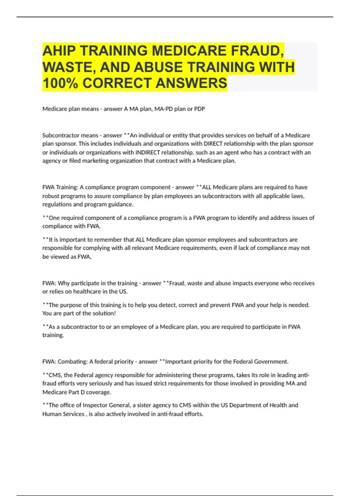 AHIP TRAINING MEDICARE FRAUD, WASTE, AND ABUSE TRAINING WITH 100% CORRECT ANSWERS