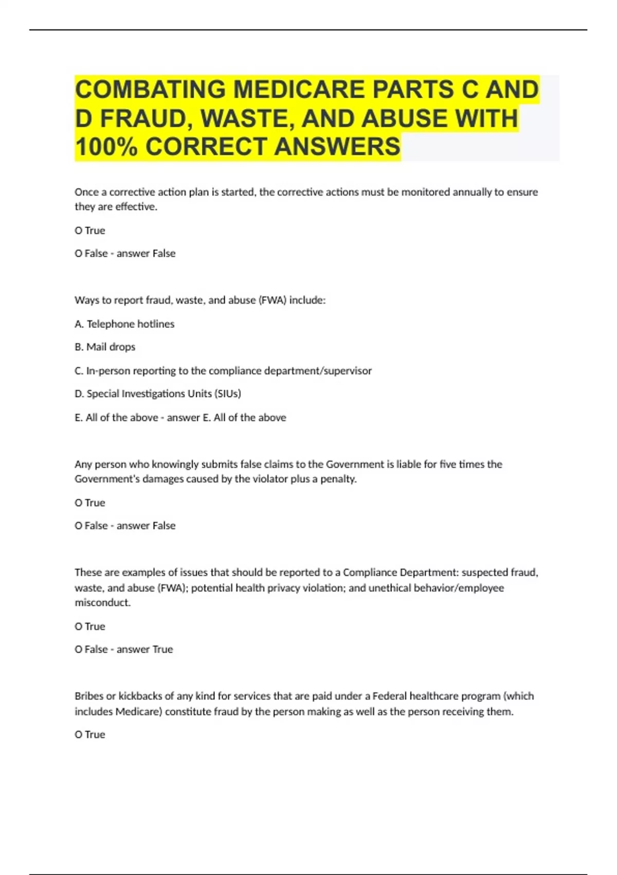 Once a corrective action plan is started, the corrective actions must be monitored annually to ensure they are effective. O True O False False Ways to report fraud, waste, and abuse (FWA) include: A. Telephone hotlines B. Mail drops C. In-person reporting to the compliance department/supervisor D. Special Investigations Units (SIUs) E. All of the above E. All of the above Any person who knowingly submits false claims to the Government is liable for five times the Government's damages caused by the violator plus a penalty. O True O False False These are examples of issues that should be reported to a Compliance Department: suspected fraud, waste, and abuse (FWA); potential health privacy violation; and unethical behavior/employee misconduct. O True O False True Bribes or kickbacks of any kind for services that are paid under a Federal healthcare program (which includes Medicare) constitute fraud by the person making as well as the person receiving them. O True O False True Waste indicates any misuse of resources such as the overuse of services, or other practices that directly or indirectly result in unnecessary costs to the Medicare Program. O True O False True Abuse involves payment for items or services when there is no legal entitlement to that payment and the provider has not knowingly and/or intentionally misrepresented facts to obtain payment. O True O False True Some of the laws governing Medicare Parts C and D Fraud, Waste, and Abuse (FWA) include the Health Insurance Portability and Accountability Act (HIPAA); the False Claim Act; the Anti-Kickback Statute; the List of Excluded Individuals and Entities (LEIE); and the Health Care Fraud Statute. O True O False True You can help prevent fraud, waste, and abuse (FWA) by doing all of the following:Look for suspicious activityConduct yourself in an ethical mannerEnsure accurate and timely data/billingEnsure you coordinate with you payersKeep up to date with FWA policies and procedures, standards of conduct, and Medicare & Medicaid Services (CMS) guidanceVerify all information provided to you O True O False True