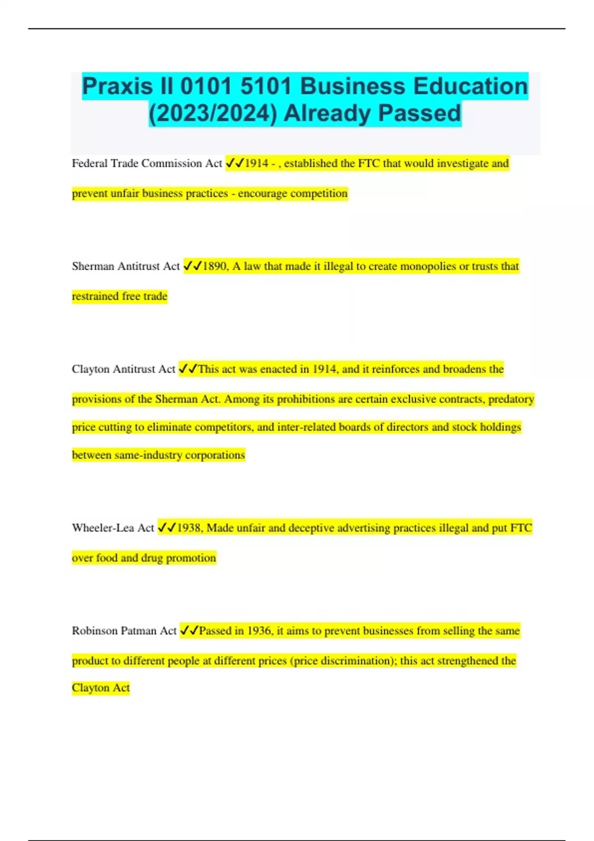 Praxis II Business Education (2023/2024) Already Passed Federal Trade Commission Act 1914 - , established the FTC that would investigate and prevent unfair business practices - encourage competition Sherman Antitrust Act 1890, A law that made it illegal to create monopolies or trusts that restrained free trade Clayton Antitrust Act This act was enacted in 1914, and it reinforces and broadens the provisions of the Sherman Act. Among its prohibitions are certain exclusive contracts, predatory price cutting to eliminate competitors, and inter-related boards of directors and stock holdings between same-industry corporations Wheeler-Lea Act 1938, Made unfair and deceptive advertising practices illegal and put FTC over food and drug promotion Robinson Patman Act Passed in 1936, it aims to prevent businesses from selling the same product to different people at different prices (price discrimination); this act strengthened the Clayton Act Food and Drug Administration (FDA) Federal agency formed in 1913 that approves all food, drugs, and cosmetics for sale in the US. Consumer Product Safety Commission (CPSC) 1972, oversees the safety of products such as toys, electronics, and household furniture Equal Employment Opportunity Commission (EEOC) 1964, ensures that employers do not discriminate against employees because of age, race, color or national origin, religion, gender, or physical challenge. Occupational Safety and Health Administration (OSHA) 1970, regulates the workplace environment; ensures that workplaces are safe and healthful for employees Securities and Exchange Commission (SEC) 1934 - regulates the stock markets Environmental Protection Agency (EPA) a federal agency established in 1970 for the regulation of water and air pollution, toxic waste, pesticides, and radiation Better Business Bureau (BBB) One of the oldest nonprofit organizations that establishes self-regulation among businesses. Americans with Disabilities Act (ADA) 1992, Protects rights of disabled individuals in employment and public accommodation; requires reasonable accommodation that enable disabled persons to work with dignity Federal Communications Commission (FCC) a government agency created in 1934 to regulate American radio stations, and later expanded to regulate television, wireless communications technologies, and other broadcast media. Unfair Trade Practices Law prevents large companies with market power from selling products at very low prices to drive out their competition. Family Medical Leave Act 1993; Requires employers with 50 or more workers to grant up to 12 weeks of unpaid leave a year to allow workers to take time off to help care for a new baby or an ill family member without fear of losing their jobs. Fair Labor Standards Act 1938 act which provided for a minimum wage and restricted shipments of goods produced with child labor Fair Credit Reporting Act 1970, A federal law that