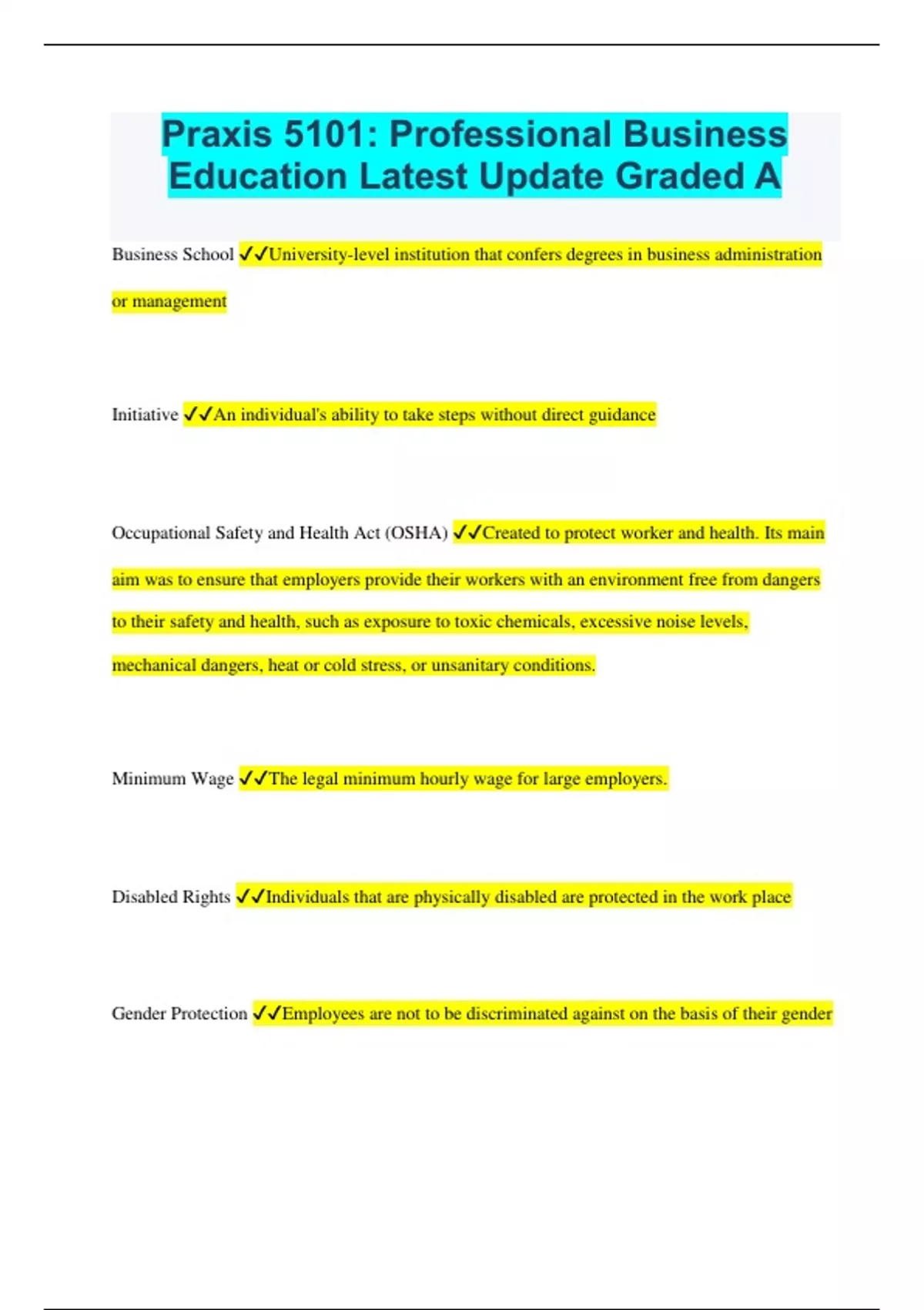Praxis 5101: Professional Business Education Latest Update Graded A Business School University-level institution that confers degrees in business administration or management Initiative An individual's ability to take steps without direct guidance Occupational Safety and Health Act (OSHA) Created to protect worker and health. Its main aim was to ensure that employers provide their workers with an environment free from dangers to their safety and health, such as exposure to toxic chemicals, excessive noise levels, mechanical dangers, heat or cold stress, or unsanitary conditions. Minimum Wage The legal minimum hourly wage for large employers. Disabled Rights Individuals that are physically disabled are protected in the work place Gender Protection Employees are not to be discriminated against on the basis of their gender Family and Medical Leave Act (FMLA) Federal law requiring organizations with 50 or more employees to provide up to 12 weeks of unpaid leave after childbirth or adoption; to care for a seriously ill family member or for an employee's own serious illness; or to take care of urgent needs that arise when a spouse, child, or parent in the National Guard or Reserve is called to active duty Maternity Leave time off from work that allows a mother to give birth, recover, and begin to care for a new baby Paternity Leave A period, usually 12 weeks, of unpaid family or medical leave from work offered to new fathers Sexual Orientation Discrimination Discrimination based on sexual identity, individuals protected in some states Strong Workplace Behaviors Responsible and reliable, active listening, positive attitude, professional behavior, helpful, flexible, accountable, and problem solver Career Planning Actions and activities that individuals perform in order to give direction to their work lives. Career Strategies Short-term and long-term goals. Realistic, consider the type of career that will suit them. Self evaluate their abilities, skills and characteristics to find jobs. Career Planning Steps Begins with personal assessment, considering strengths, weaknesses, abilities, dislikes, likes. Consider working salary, hours, conditions. Research opportunities, start generally and move to more narrow pursuits. Multi layered, flexible plans. Employment Resources Career centers at schools, employment agencies and recruiters, internet job boards, job fairs, classified advertisements, personal networking Job Skill Development Internships, job shadowing, apprenticeships, part-time jobs, volunteering, school-to-work programs Resume A brief account of one's work experience and qualifications. Resume Qualities Professional and comprehensive, all pertinent information. Objective is necessary to state what the employee is searching for. GPA is included if it is impressive, must list experience, work dates, responsibilities and accomplishments. Assess individuals skills. List accolades and awards. Cover Letter A letter you send with your resume to provide more information about you. Strong Cover Letter Customize the letter to each job, address to a specific person (if possible), focus on how candidate would benefit the company, it should show impressive and substantiated information, explain how the candidate meets the qualifications, be succinct and not long (one page). Job Applications Application form to fill out for employment Strong Job Application Use blue or black ink, erasable pens are are useful. Neat print and legible. No blanks, use N/A instead. Explain long employment gaps, personal fact sheet may benefit the employee Job Interviews Formal meetings between you and your potential employer Job Interview Preperation Consider the most commonly asked questions, practice with a friend. Research the company so to show initiative and understanding. Prepare resume, portfolio and other necessary professional documents. Dress appropriate to the interview, be friendly and enthusiastic. Show good body language, maintain eye contact. Listen to questions and answer fully. Support information, send thank you card after interview. Career and Technical Student Organization (CTSO) Organizations dedicated to helping students learn and prepare for careers. Many times offer mentoring opportunities. Often the students benefit from the experience from faculty advisors. Some even offer scholarships. Good start for students embarking in careers. CTSO Benefits Provide pertinent experience and networking opportunities. Can help gain internships or jobs. CTSO looks good on a resume. CTSO Faculty Advisors Provide information and guidance to business students in the organization. Possibly just information in general. May attend students at events. Facilitate networking and mentor business students. National Business Education Association (NBEA) Professional organization devoted exclusively to serving individuals and groups engaged in instruction, administration, research, and dissemination of information for and about business. Provides publications, national conventions, networking opportunities, advocacy in legislative issues, national development and information regarding national business. Has social media presence. DECA Started in 1946 to help high school and college students prepare for business jobs in the fields of management, marketing, finance, and hospitality. 200,000 members provides countless opportunities for those interested in business. Several competitions and skill demonstrations. Network of over 5000 advisors, DECA offers leadership conferences and development conferences. Future Business Leaders of America (FBLA) 200,000 members that make it the largest career organization for business students. Offers competitions for students to demonstrate knowledge. Lets students learn about current trends and ways to make their career goals come true. Local and national conferences, offers leadership events for members and local officers Business Professionals of America 43000 Members, one of the largest caree