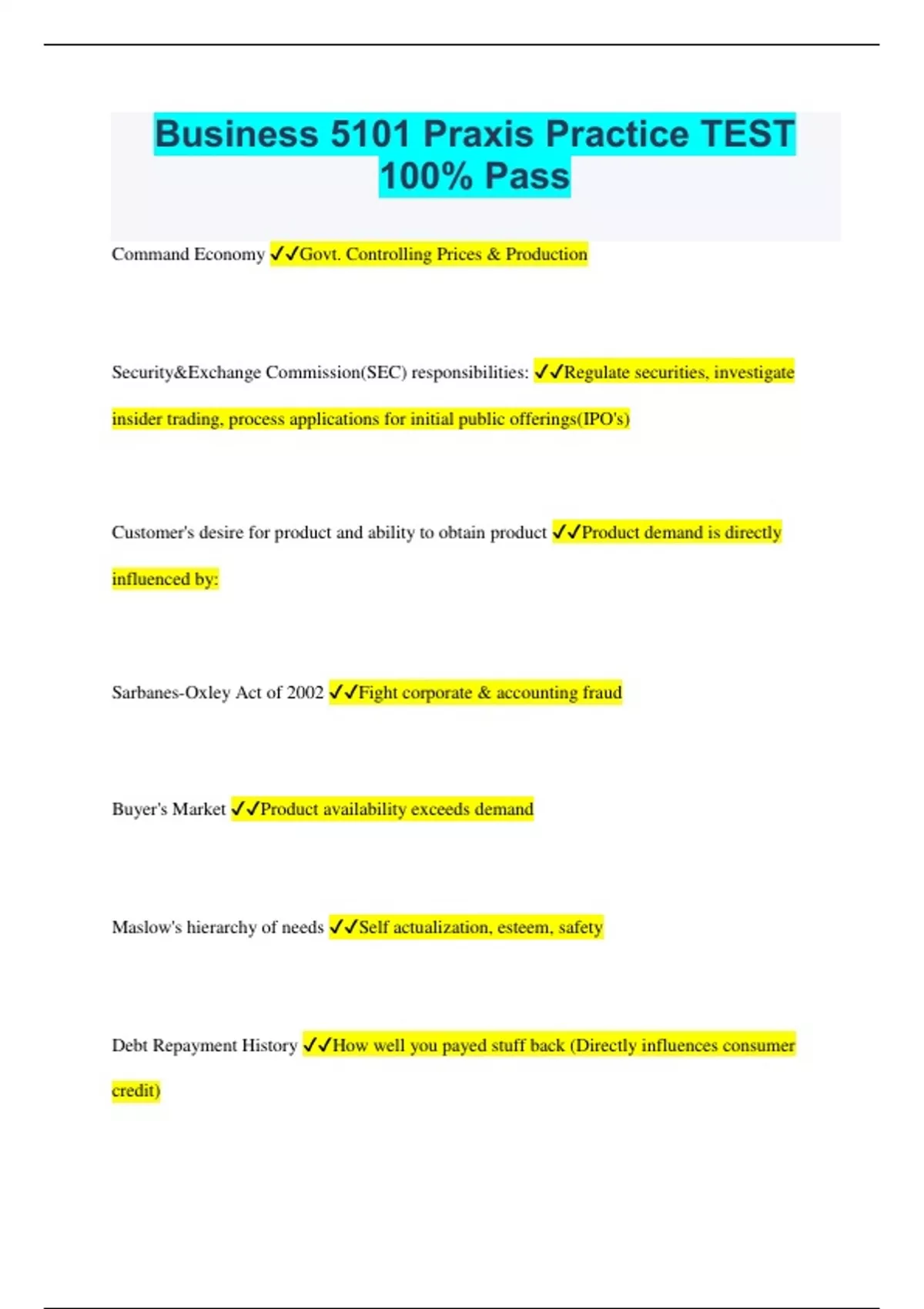 Business 5101 Praxis Practice TEST 100% Pass Command Economy Govt. Controlling Prices & Production Security&Exchange Commission(SEC) responsibilities: Regulate securities, investigate insider trading, process applications for initial public offerings(IPO's) Customer's desire for product and ability to obtain product Product demand is directly influenced by: Sarbanes-Oxley Act of 2002 Fight corporate & accounting fraud Buyer's Market Product availability exceeds demand Maslow's hierarchy of needs Self actualization, esteem, safety Debt Repayment History How well you payed stuff back (Directly influences consumer credit) World Trade Organization (WTO) Deals with claims of unfair protectionism by 1 country against another. Tries to reduce trade barriers and governs trade agreements in areas such as agriculture and intellectual property. Low Labor Costs #1 factor that leads American companies to manufacture overseas: Accounting equation & shown in balance sheet. AKA: FUNDAMENTAL ACCOUNTING EQUATION Assets=Liabilities+Owner's Equity Powerpoint Microsoft presentation program- great for presenting business plans, etc. Important tools for starting online business: Business model, website, email address Assets that can depreciate(lose value) over time Heavy equipment(bulldozer), computers, company vehicles These are deductible when itemizing on tax return: Mortgage interest, charitable donations, losses from theft Franchise Individual pays to enter into an agreement with a company to use the company's business model in certain area Par Value of a Bond Amount paid when the bond matures Freddie Mac (1970) was set up to: Expand opportunities for home ownership Raise interest rates If US Federal Reserve sees risk of inflation they will: Stagflation Combination of slow economic growth and high inflation Stock Dividends Usually taxable, offered voluntarily by companies to make their stock more attractive, may be discontinued or stopped at any time P/E ratio Comparison of current price of stock relative to its "per earning share"....its ability to earn money per share. Helps investors to put a value to the company. US Treasury Bonds Govt. bonds that offer safe investment Dow Jones Industrial Average Stock trading market for well known corporations with large market capital Assess personal financial situation 1st step in planning to start small business Net Exporter Value of goods exported by country exceeds value of goods imported by country Import tariff Fee country attaches to imported products to protect domestic products from foreign competition Buying