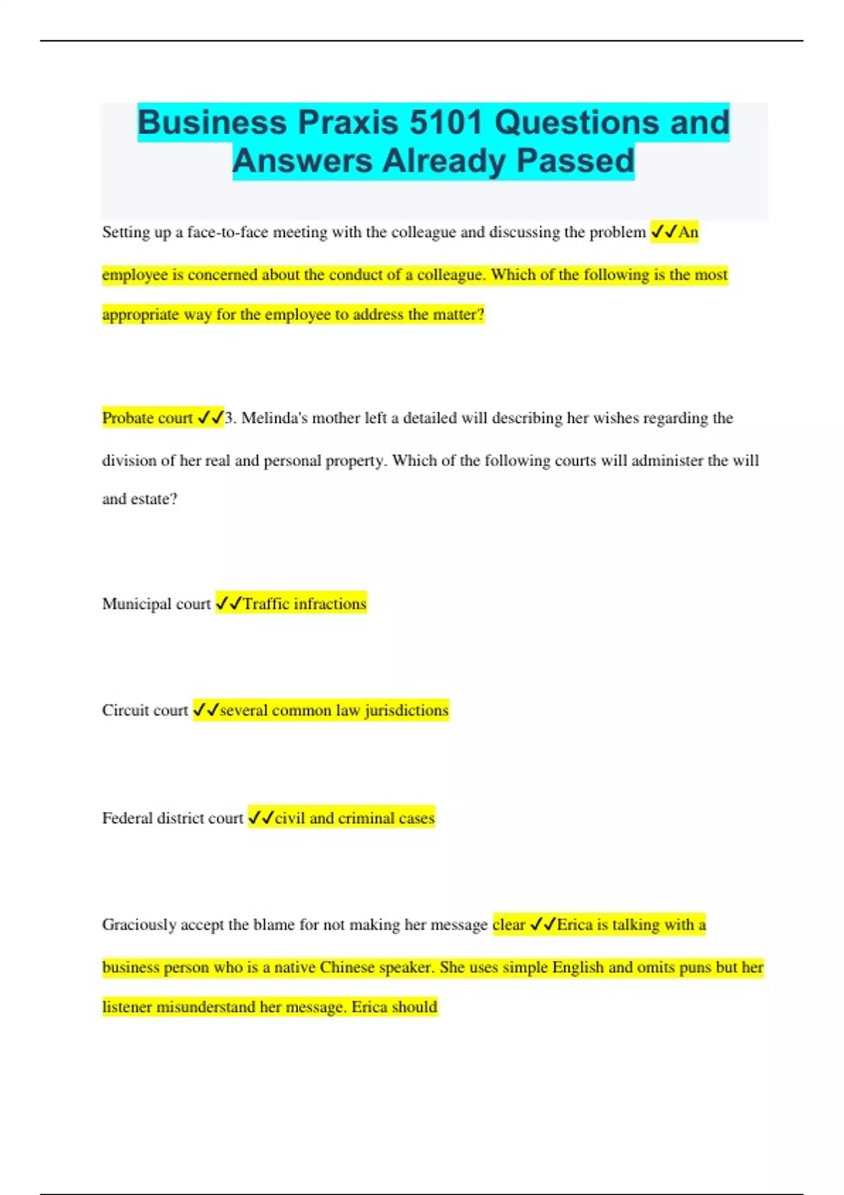 Business Praxis 5101 Questions and Answers Already Passed Setting up a face-to-face meeting with the colleague and discussing the problem An employee is concerned about the conduct of a colleague. Which of the following is the most appropriate way for the employee to address the matter? Probate court 3. Melinda's mother left a detailed will describing her wishes regarding the division of her real and personal property. Which of the following courts will administer the will and estate? Municipal court Traffic infractions Circuit court several common law jurisdictions Federal district court civil and criminal cases Graciously accept the blame for not making her message clear Erica is talking with a business person who is a native Chinese speaker. She uses simple English and omits puns but her listener misunderstand her message. Erica should Coupons in the local weekly newspaper A local game store is trying to attract member of the Gen Y. Which of the following promotional approaches will primarily get the attention of Gen Y consumers? Memo Sarah wants to thank her boss for allowing her to attend a business-related seminar and then share what she learned from the seminar. Which of the following is the most appropriate form of communication for Sarah to use? A corporation is a legal entity that is separate and distinct from its owners. Which of the following types of business ownership is a legal entity that is chartered by state and separate from its owners? joint venture is a business entity created by two or more parties, generally characterised by shared ownership, shared returns and risks, and shared governance. partnership a single business where two or more people share ownership. Each partner contributes to all aspects of the business, including money, property, labor or skill. In return, each partner shares in the profits and losses of the business. sole proprietorship the simplest business form under which one can operate a business. not a legal entity. It simply refers to a person who owns the business and is personally responsible for its debts. The US Treasury is NOT a depository institution? To protect its consumers and industries a primary reason a country might use import tariffs, quotas, or licensing requirements Questioning coworkers during a lunch break most closely represents and example of using the grapevine to get information about a company policy change? Blog Collaborators leave only comments to be viewed (Wiki or Blog) WIKI The organisation of the site is a hyperlinked collection of individual pages (Wiki or Blog) Both The site incorporates a type of social software that facilitates individuals' collective desire to achieve goals as a group (Wiki or Blog) Limited partners Two business people invested $300000 each in the same new venture and have listed themselves as non-decision makers in the partnership agreement. Which of the following roles do they have in the new venture Shareholders an owner of shares in a company. Stakeholders can affect or be affected by the organisation's actions, objectives and policies. creditors, directors, employees, government (and its agencies), owners (shareholders), suppliers, unions, and the community from which the business draws its resources. General partners a person who joins with at least one other person to form a business. responsibility for the actions of the business, can legally bind the business and is personally liable for all the business's debts and obligations. Periodic rate actual rate of interest received on a savings account Annual rate corresponding sometimes to a nominal APR and sometimes to an effective APR (or EAPR), describes the interest rate for a whole year (annualised), rather than just a monthly fee/rate, as applied on a loan, mortgage loan, credit card, etc. Effective rate the interest rate on a loan or financial product restated from the nominal interest rate as an interest rate with annual compound interest payable in arrears. Nominal rate is the rate quoted in loan and deposit agreements