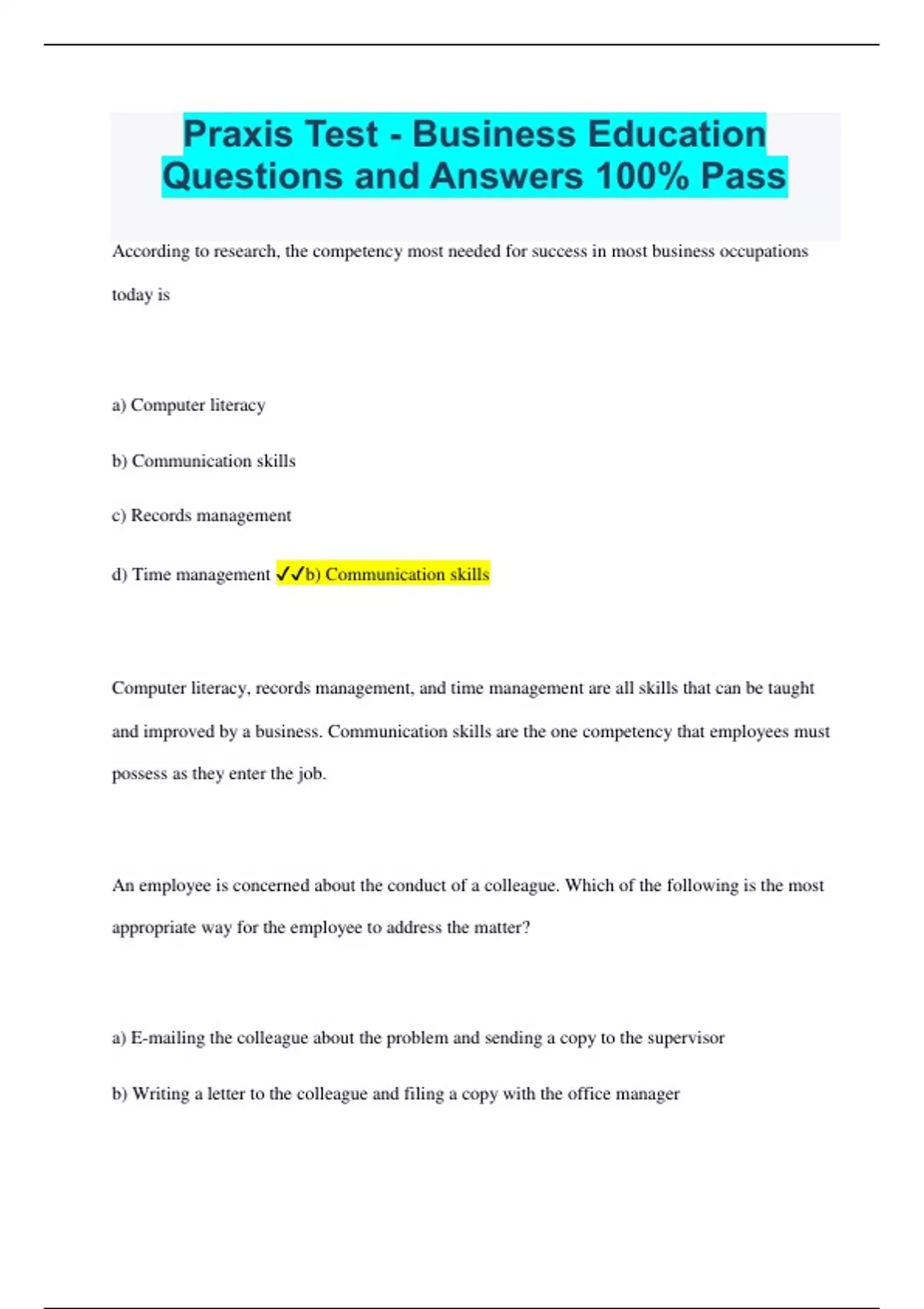Praxis Test - Business Education Questions and Answers 100% Pass According to research, the competency most needed for success in most business occupations today is a) Computer literacy b) Communication skills c) Records management d) Time management b) Communication skills Computer literacy, records management, and time management are all skills that can be taught and improved by a business. Communication skills are the one competency that employees must possess as they enter the job. An employee is concerned about the conduct of a colleague. Which of the following is the most appropriate way for the employee to address the matter? a) E-mailing the colleague about the problem and sending a copy to the supervisor b) Writing a letter to the colleague and filing a copy with the office manager c) Ignoring the problem and focusing on a positive aspect of the colleague d) Setting up a face-to-face meeting with the colleague and discussing the problem d) Setting up a face-to-face meeting with the colleague and discussing the problem A face-to-face meeting permits both parties to exchange ideas, view nonverbal cues, and move more quickly to solving the problem. Of the following, which primarily benefits an American multinational company? a) Implementation of a positive trade agenda b) Enactment of policies that reduce foreign direct investments c) Increased competition with foreign state-owned enterprises d) Exclusion from global supply chains a) Implementation of a positive trade agenda A positive trade agenda is beneficial to American multinational companies Melinda's mother left a detailed will describing her wishes regarding the division of her real and personal property. Which of the following courts will administer the will and estate? a) Municipal court b) Circuit court c) Federal district court d) Probate court d) Probate court Probate court deals with the legal certification of wills and the administration of estates of the deceased. Which of the following is a primary reward for an entrepreneur? a) Showcasing one's unique expertise and skills b) Assuming total responsibility for the business c) Working extensive hours d) Enduring financial risks a) Showcasing one's unique expertise and skills Advantages of an entrepreneurship are satisfaction from taking a risk and becoming a success, showing expertise and skills, working from home, and gaining a profit. A company's IT department designs computer systems that meet the needs of the company. The computer systems are created in layers. Place each of the following components of a computer system in order from bottom to top. Application software End user Hardware Operating system Bottom - Hardware - Operating system - Application software - End user Top The hardware is the bottom, or the basis, of any computer system. It's the shell. The operating systems connects to the hardware, and it's the platform where the application software lives. The application software is what the end user uses to computer and manipulate information. The end user is the top of the system. The user can't compute without the other components in the correct order. A local game store is trying to attract members of generation Y. Which of the following promotional approaches will primarily get the attention of generation Y consumers? a) Coupons in the local weekly newspaper b) A commercial on a national radio station c) Information posted on a company Web site d) A full-page advertisement in a national magazine c) Information posted on a company Web site Members of generation Y are technologically savvy; they have grown up with computers and the Internet playing a significant part of their lives. Sarah wants to thank her manager for allowing
