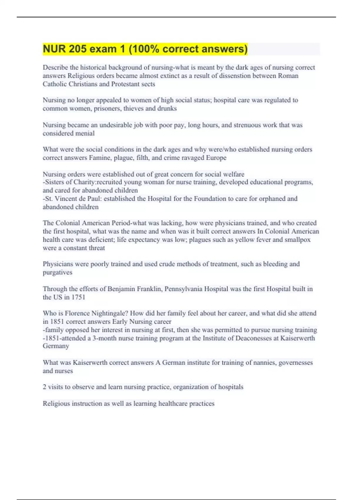 Describe the historical background of nursing-what is meant by the dark ages of nursing correct answers Religious orders became almost extinct as a result of dissenstion between Roman Catholic Christians and Protestant sects Nursing no longer appealed to women of high social status; hospital care was regulated to common women, prisoners, thieves and drunks Nursing became an undesirable job with poor pay, long hours, and strenuous work that was considered menial What were the social conditions in the dark ages and why were/who established nursing orders correct answers Famine, plague, filth, and crime ravaged Europe Nursing orders were established out of great concern for social welfare -Sisters of Charity:recruited young woman for nurse training, developed educational programs, and cared for abandoned children -St. Vincent de Paul: established the Hospital for the Foundation to care for orphaned and abandoned children The Colonial American Period-what was lacking, how were physicians trained, and who created the first hospital, what was the name and when was it built correct answers In Colonial American health care was deficient; life expectancy was low; plagues such as yellow fever and smallpox were a constant threat Physicians were poorly trained and used crude methods of treatment, such as bleeding and purgatives Through the efforts of Benjamin Franklin, Pennsylvania Hospital was the first Hospital built in the US in 1751 Who is Florence Nightingale? How did her family feel about her career, and what did she attend in 1851 correct answers Early Nursing career -family opposed her interest in nursing at first, then she was permitted to pursue nursing training -1851-attended a 3-month nurse training program at the Institute of Deaconesses at Kaiserwerth Germany What was Kaiserwerth correct answers A German institute for training of nannies, governesses and nurses 2 visits to observe and learn nursing practice, organization of hospitals Religious instruction as well as learning healthcare practices