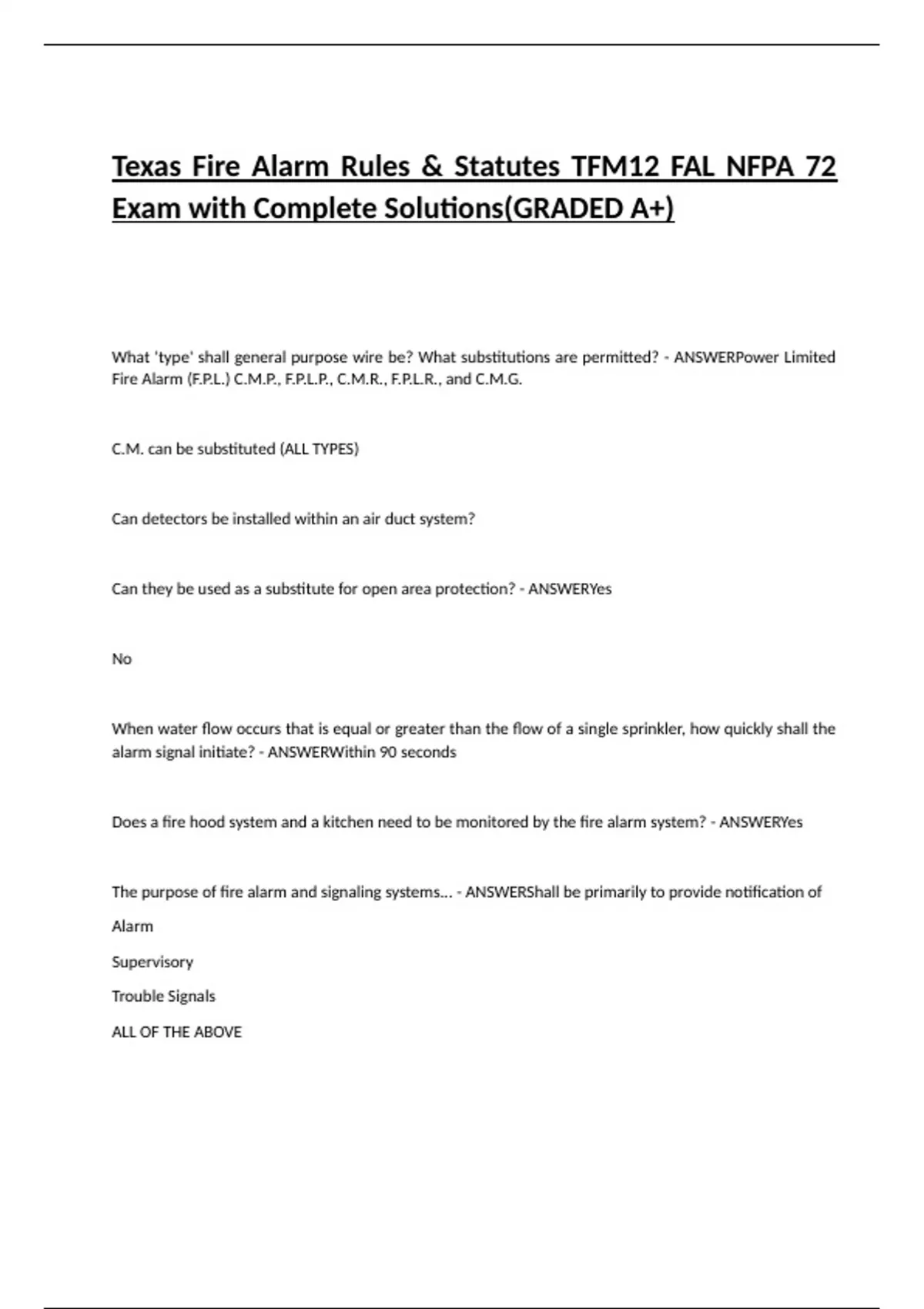 Texas Fire Alarm Rules & Statutes TFM12 FAL NFPA 72 Exam with Complete Solutions(GRADED A+)