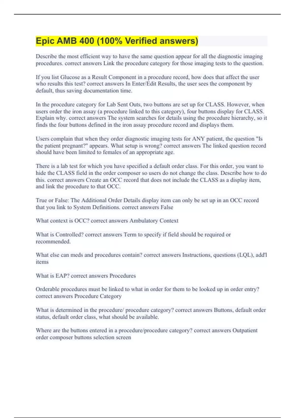 Describe the most efficient way to have the same question appear for all the diagnostic imaging procedures. correct answers Link the procedure category for those imaging tests to the question. If you list Glucose as a Result Component in a procedure record, how does that affect the user who results this test? correct answers In Enter/Edit Results, the user sees the component by default, thus saving documentation time. In the procedure category for Lab Sent Outs, two buttons are set up for CLASS. However, when users order the iron assay (a procedure linked to this category), four buttons display for CLASS. Explain why. correct answers The system searches for details using the procedure hierarchy, so it finds the four buttons defined in the iron assay procedure record and displays them. Users complain that when they order diagnostic imaging tests for ANY patient, the question "Is the patient pregnant?" appears. What setup is wrong? correct answers The linked question record should have been limited to females of an appropriate age. There is a lab test for which you have specified a default order class. For this order, you want to hide the CLASS field in the order composer so users do not change the class. Describe how to do this. correct answers Create an OCC record that does not include the CLASS as a display item, and link the procedure to that OCC. True or False: The Additional Order Details display item can only be set up in an OCC record that you link to System Definitions. correct answers False What context is OCC? correct answers Ambulatory Context What is Controlled? correct answers Term to specify if field should be required or recommended. What else can meds and procedures contain? correct answers Instructions, questions (LQL), add'l items What is EAP? correct answers Procedures Orderable procedures must be linked to what in order for them to be looked up in order entry? correct answers Procedure Category What is determined in the procedure/ procedure category? correct answers Buttons, default order status, default order class, what should be available. Where are the buttons entered in a procedure/procedure category? correct answers Outpatient order composer buttons selection screen gory for those imaging tests to the question. If you list Glucose as a Result Component in a procedure record, how does that affect the user who results this test? correct answers In Enter/Edit Results, the user sees the component by default, thus saving documentation time. In the procedure category for Lab Sent Outs, two buttons are set up for CLASS. However, when users order the iron assay (a procedure linked to this category), four buttons display for CLASS. Explain why. correct answers The system searches for details using the procedure hierarchy, so it finds the four buttons defined in the iron assay procedure record and displays them. Users complain that when they order diagnostic imaging tests for ANY patient, the question "Is the patient pregnant?" appears. What setup is wrong? correct answers The linked question record should have been limited to females of an appropriate age. There is a lab test for which you have specified a default order class. For this order, you want to hide the CLASS field in the order composer so users do not change the class. Describe how to do this. correct answers Create an OCC record that does not include the CLASS as a display item, and link the procedure to that OCC. True or False: The Additional Order Details display item can only be set up in an OCC record that you link to System Definitions. correct answers False What context is OCC? correct answers Ambulatory Context What is Controlled? correct answers Term to specify if field should be required or recommended. What else can meds and procedures contain? correct answers Instructions, questions (LQL), add'l items What is EAP? correct answers Procedures Orderable procedures must be linked to what in order for them to be looked up in order entry? correct answers Procedure Category What is determined in the procedure/ procedure category? correct answers Buttons, default order status, default order class, what should be available. Where are the buttons entered in a procedure/procedure category? correct answers Outpatient order composer buttons selection screen