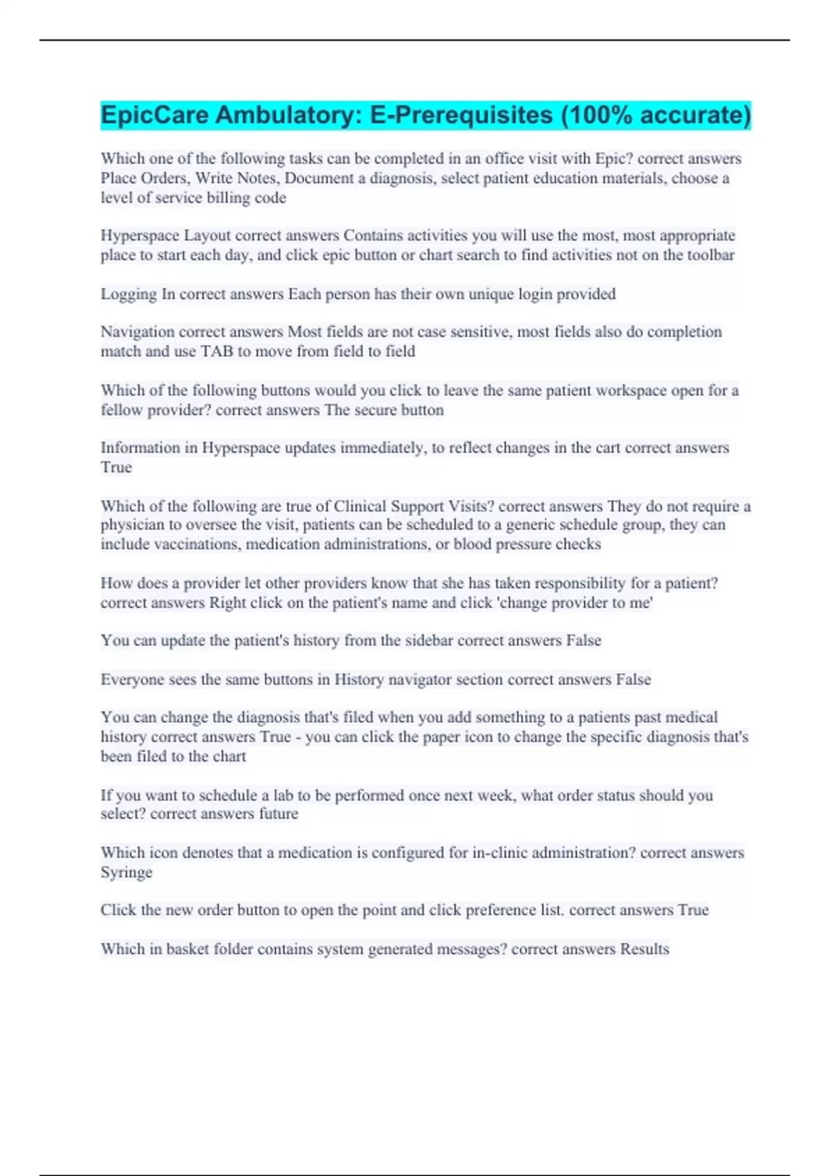 EpicCare Ambulatory: E-Prerequisites (100% accurate)