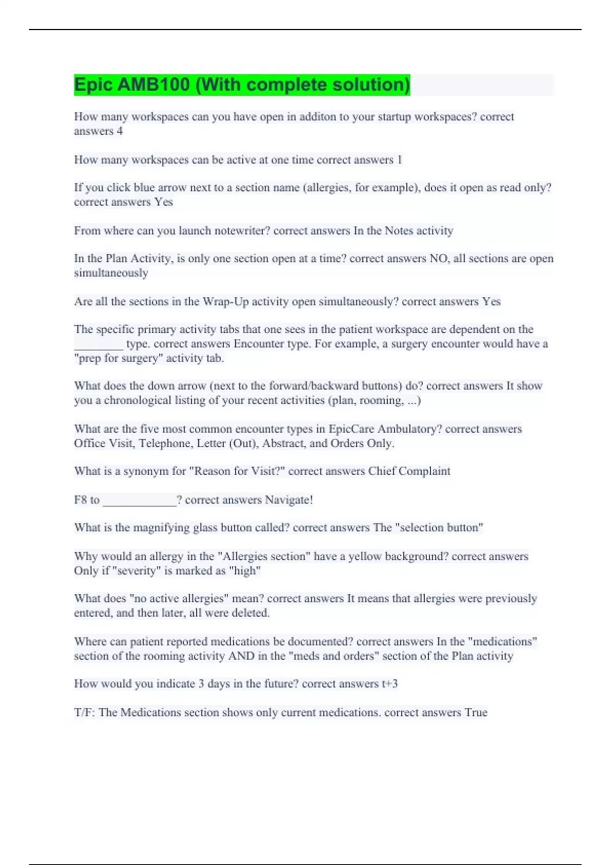 How many workspaces can you have open in additon to your startup workspaces? correct answers 4 How many workspaces can be active at one time correct answers 1 If you click blue arrow next to a section name (allergies, for example), does it open as read only? correct answers Yes From where can you launch notewriter? correct answers In the Notes activity In the Plan Activity, is only one section open at a time? correct answers NO, all sections are open simultaneously Are all the sections in the Wrap-Up activity open simultaneously? correct answers Yes The specific primary activity tabs that one sees in the patient workspace are dependent on the ________ type. correct answers Encounter type. For example, a surgery encounter would have a "prep for surgery" activity tab. What does the down arrow (next to the forward/backward buttons) do? correct answers It show you a chronological listing of your recent activities (plan, rooming, ...) What are the five most common encounter types in EpicCare Ambulatory? correct answers Office Visit, Telephone, Letter (Out), Abstract, and Orders Only. What is a synonym for "Reason for Visit?" correct answers Chief Complaint F8 to ____________? correct answers Navigate! What is the magnifying glass button called? correct answers The "selection button" Why would an allergy in the "Allergies section" have a yellow background? correct answers Only if "severity" is marked as "high" What does "no active allergies" mean? correct answers It means that allergies were previously entered, and then later, all were deleted. Where can patient reported medications be documented? correct answers In the "medications" section of the rooming activity AND in the "meds and orders" section of the Plan activity How would you indicate 3 days in the future? correct answers t+3 T/F: The Medications section shows only current medications. correct answers True