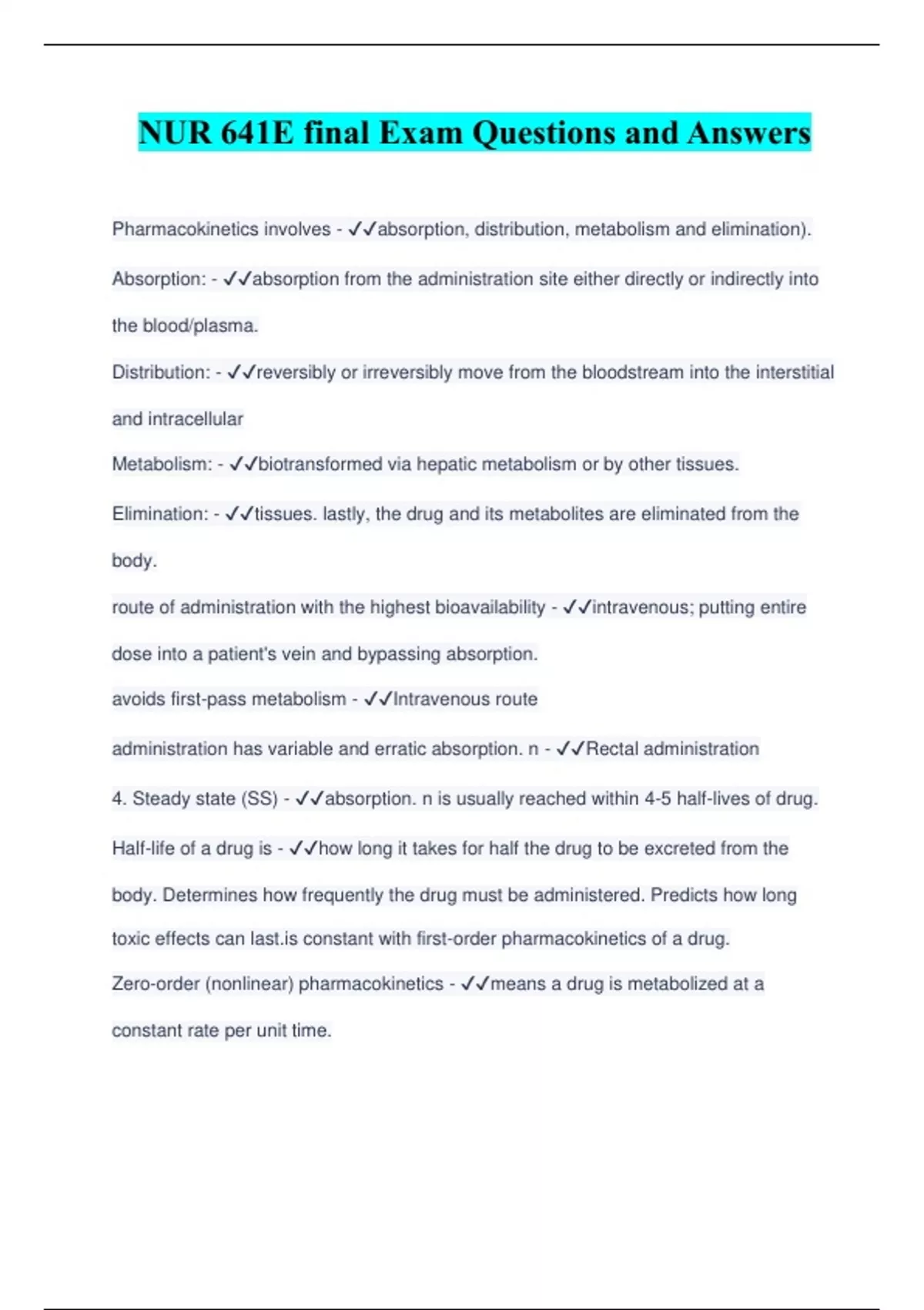 NUR 641E final Exam Questions and Answers Pharmacokinetics involves - ️️ absorption, distribution, metabolism and elimination). Absorption: - ️️ absorption from the administration site either directly or indirectly into the blood/plasma. Distribution: - ️️ reversibly or irreversibly move from the bloodstream into the interstitial and intracellular Metabolism: - ️️ biotransformed via hepatic metabolism or by other tissues. Elimination: - ️️ tissues. lastly, the drug and its metabolites are eliminated from the body. route of administration with the highest bioavailability - ️️ intravenous; putting entire dose into a patient's vein and bypassing absorption. avoids first-pass metabolism - ️️ Intravenous route administration has variable and erratic absorption. n - ️️ Rectal administration 4. Steady state (SS) - ️️ absorption. n is usually reached within 4-5 half-lives of drug. Half-life of a drug is - ️️ how long it takes for half the drug to be excreted from the body. Determines how frequently the drug must be administered. Predicts how long toxic effects can constant with first-order pharmacokinetics of a drug. Zero-order (nonlinear) pharmacokinetics - ️️ means a drug is metabolized at a constant rate per unit time.