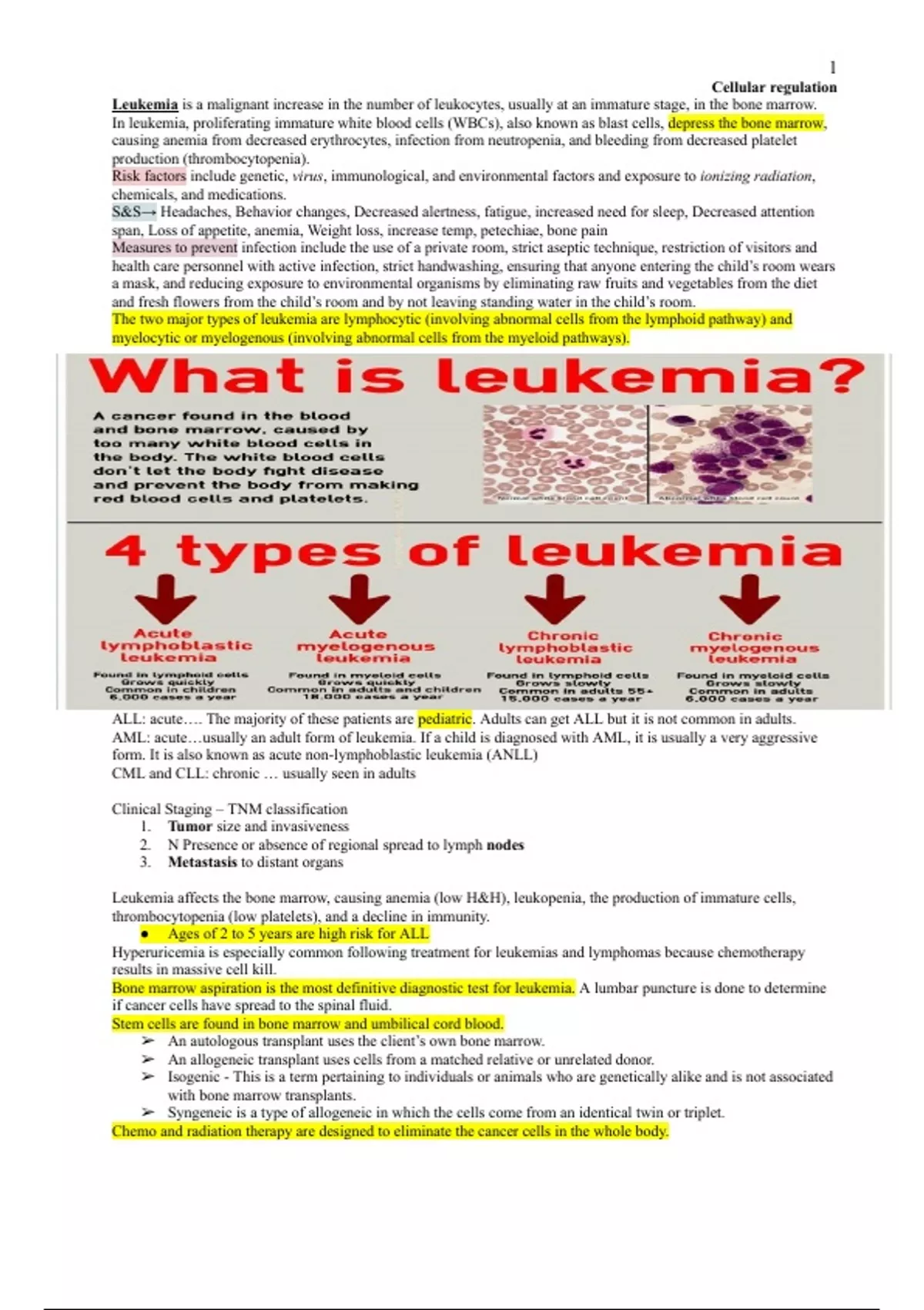 This is notes for exam 3. It has information about Cellular regulation (leukemia, lung cancer, skin cancer, breast cancer, and HPV); Intraregulation regulation (stroke, meningitis, and spinal headache from anesthesia); Reproduction Complications (preeclampsia, miscarriage, ectopic pregnancy, premature infant, and respiratory distress syndrome); Psychosis (alcoholism, schizophrenia, and postpartum psychosis) This paper has all the important information that has been mentioned in class by the professor. I got an A with studying my study guide. Hopefully, it helps! If you have any questions, please message me. Thank you, and please leave a review!
