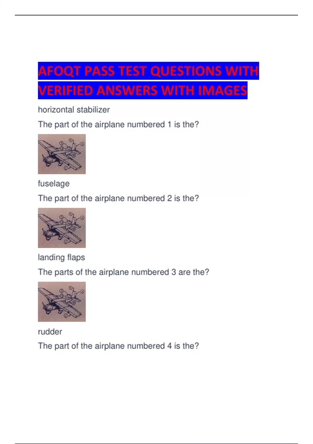 AFOQT PASS TEST QUESTIONS WITH VERIFIED ANSWERS WITH IMAGES horizontal stabilizer The part of the airplane numbered 1 is the? fuselage The part of the airplane numbered 2 is the? landing flaps The parts of the airplane numbered 3 are the? rudder The part of the airplane numbered 4 is the? leading edge, left wing The part of the airplane numbered 5 is the? vertical stabilizer The part of the airplane numbered 6 is part of the? high wing-externally braced; tricycle type landing gear The airplane in the diagram may best be described as? nose wheel The landing gear on the airplane in the diagram has a? trim tab The small hinged section on the elevator of most airplanes is called the? tapered leading edge, straight trailing edge The wing shape shown is best described as? bank Movement about the longitudinal axis of the aircraft is termed? (E) Wind velocity Which one of the following does NOT affect density altitude? (A) Altitude (B) Atmospheric pressure (C) Moisture content of air
