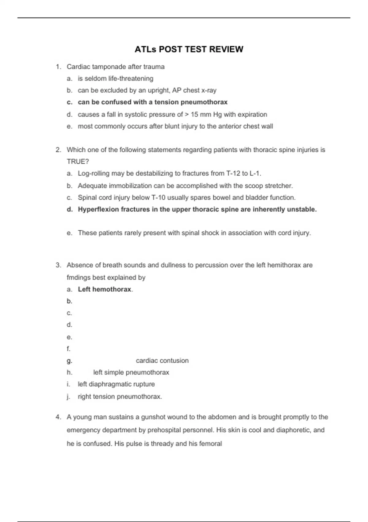 ATLs POST TEST REVIEW 1. Cardiac tamponade after trauma a. is seldom life-threatening b. can be excluded by an upright, AP chest x-ray c. can be confused with a tension pneumothorax d. causes a fall in systolic pressure of > 15 mm Hg with expiration e. most commonly occurs after blunt injury to the anterior chest wall 2. Which one of the following statements regarding patients with thoracic spine injuries is TRUE? a. Log-rolling may be destabilizing to fractures from T-12 to L-1. b. Adequate immobilization can be accomplished with the scoop stretcher. c. Spinal cord injury below T-10 usually spares bowel and bladder function. d. Hyperflexion fractures in the upper thoracic spine are inherently unstable. e. These patients rarely present with spinal shock in association with cord injury. 3. Absence of breath sounds and dullness to percussion over the left hemithorax are fmdings best explained by a. Left hemothorax. b. c. d. e. f. g. cardiac contusion h. left simple pneumothorax i. left diaphragmatic rupture j. right tension pneumothorax. 4. A young man sustains a gunshot wound to the abdomen and is brought promptly to the emergency department by prehospital personnel. His skin is cool and diaphoretic, and he is confused. His pulse is thready and his femoral pulse is only weakly palpable. The defmitive treatment in managing this patient is to a. administer 0-negative blood b. applyextemal warming devices. c. Control internal hemorrhage operatively d. apply the pneumatic antishock garment e. infuse large volumes of intravenous crystalloid solution. 5. To establish a diagnosis of shock, a. systolic blood pressure must be below 90 mm Hg. b. the presence of a closed head injury should be excluded c. acidosis should be present by arterial blood gas analysis d. the patient must fail to respond to intravenous fluid infusion. e. clinical evidence of inadequate organ perfusion must be present. 6. A 23-year-old man is brought immediately to the emergency department from the hospital' s parking lot where he was shot in the lower abdomen. Examination reveals a single bullet wound. He is breathing and has a thready pulse. However, he is unconscious and has no detectable blood pressure. Optimal immediate management is to a. perform diagnostic peritoneal lavage. b. initiate infusion of packed red blood cells. c. insert a nasogastric tube and urinary catheter. d. transfer the patient to the operating room, while initiating fluid therapy. e. initiate fluid therapy to return his blood pressure to normotensive 7. An electrician is electrocuted by a downed power line after a thunderstorm. He apparently made contact with the wire at the level of the right mid thigh. In the emergency department, his vital signs are normal and no dysrhythmia is noted on ECG. On examination, there is an exit wound on the bottom of the right foot. His urine is positive for blood by dip stick but no RBCs are seen microscopically. Initial management should include a. immediate angiography. b. aggressive fluid infusion. c. intravenouspyleography. d. debridement of necrotic muscle. e. admission to the intensive care unit for observation. 8. An 8-year-old girl is an unrestrained passenger in a vehicle struck from behind. In the emergency department, her blood pressure is 80/60 mm Hg, heart rate is 80 beats per minute, and respiratory rate is 16 breaths per minute. Her GCS score is 14. She complains that her legs feel "funny and won't move right;" however, her spine x-rays do not show a fracture or dislocation. A spinal cord injury in this child a. is most likely a central cord syndrome. b. must be diagnosed by magnetic resonance imaging. c. can be excluded by obtaining a CT of the entire spine. d. may exist in the absence of objective findings on x-ray studies. e. is unlikely because of the incomplete calcification of the vertebral bodies. 9. Immediate chest tube insertion is indicated for which of the following conditions? a. Pneumothorax b. Pneumomediastinum c. Massive hemothorax d. Diaphragmatic rupture e. Subcutaneous emphysema 10.A 32-year-old man is brought to the hospital unconscious with severe facial injuries and noisy respirations after an automobile collision. In the emergency department, he has no apparent injury to the anterior aspect of his neck. He suddenly becomes apneic, and attempted ventilation with a face mask is unsuccessful. Examination of his mouth reveals a large hematoma of the pharynx with loss of normal anatomic landmarks. Initial management of his airway should consist of a. inserting an oropharyngealairvvay. b. inserting a nasopharyngeal airway. c. performing a surgical cricothyroidotomy. d. performingfiberoptic-guided nasotracheal intubation. e. performingorotracheal intubation after obtaining a lateral c-spine x-ray. 11.The primary indication for transferring a patient to a higher level trauma center is a. unavailability of a surgeon or operating room staff. b. multiple system injuries, including severe head injury. c. resource limitations as determined by the transferring doctor. d. resource limitations as determined by the hospital administration. e. widened mediastinum on chest x-ray following blunt thoracic trauma. 12.A young man sustains a ritle wound to the mid-abdomen. He is brought promptly to the emergency department by prehospital personnel. His skin is cool and diaphoretic, and his systolic blood pressure is 58 rnm Hg. Warmed crystalloid fluids are initiated without improvement in his vital signs. The next, most appropriate step is to perform a. celiotomy. b. an abdominal CT scan. c. diagnostic laparoscopy. d. abdominal ultrasonography. e. a diagnostic peritoneal lavage. 13.A teen-aged bicycle rider is hit by a truck traveling at a high rate of speed. In the emergency department, she is actively bleeding from open fractures of her legs, and has abrasions on her chest and abdominal wall. Her blood pressure is 80/50 mm Hg, heart rate is 140 beats per minute, respiratory rate is 8 breaths per minut