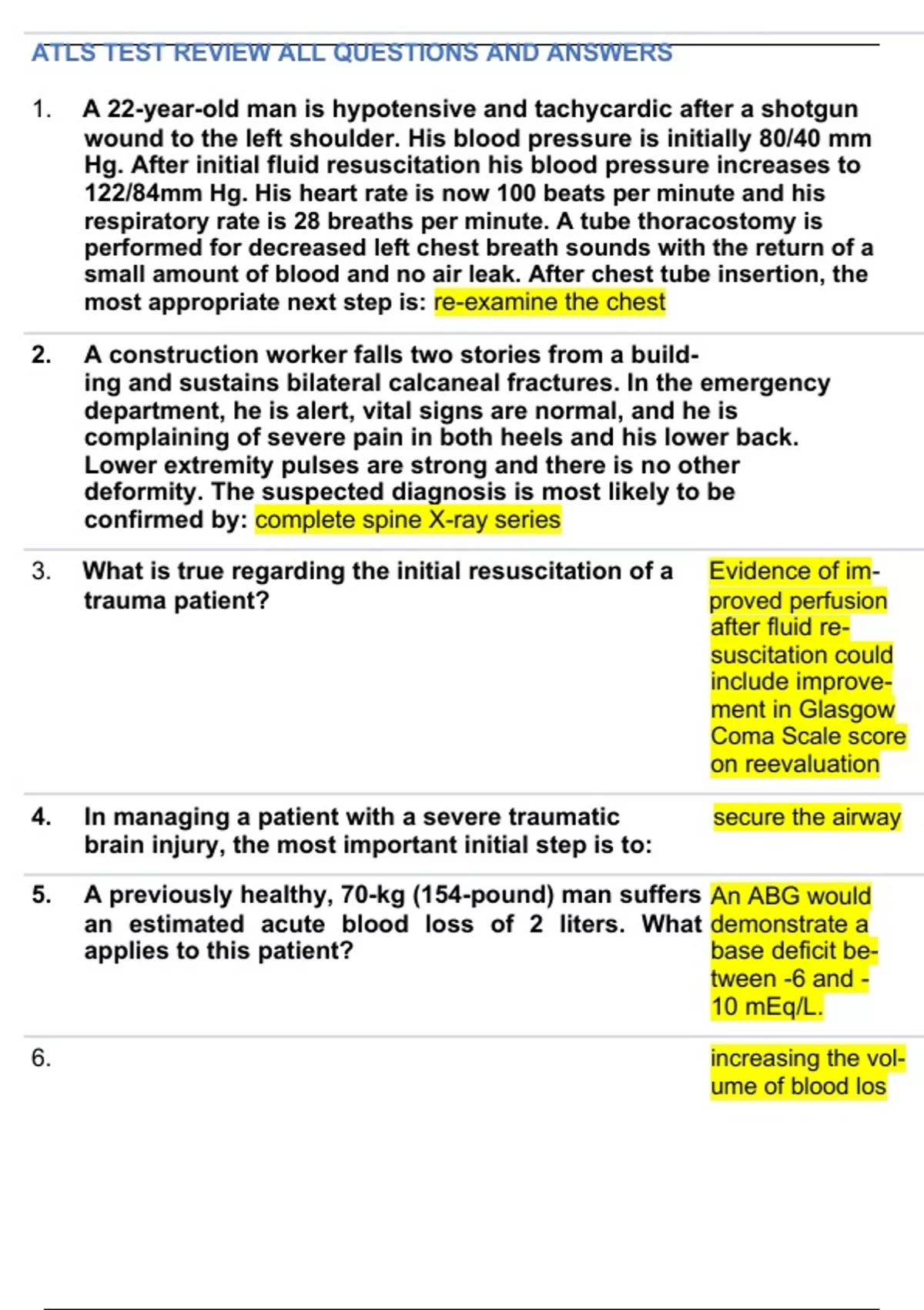 1. A 22-year-old man is hypotensive and tachycardic after a shotgun wound to the left shoulder. His blood pressure is initially 80/40 mm Hg. After initial fluid resuscitation his blood pressure increases to 122/84mm Hg. His heart rate is now 100 beats per minute and his respiratory rate is 28 breaths per minute. A tube thoracostomy is performed for decreased left chest breath sounds with the return of a small amount of blood and no air leak. After chest tube insertion, the most appropriate next step is: re-examine the chest 2. A construction worker falls two stories from a build- ing and sustains bilateral calcaneal fractures. In the emergency department, he is alert, vital signs are normal, and he is complaining of severe pain in both heels and his lower back. Lower extremity pulses are strong and there is no other deformity. The suspected diagnosis is most likely to be confirmed by: complete spine X-ray series 3. What is true regarding the initial resuscitation of a Evidence of im- trauma patient? proved perfusion after fluid re- suscitation could include improve- ment in Glasgow Coma Scale score on reevaluation 4. In managing a patient with a severe traumatic brain injury, the most important initial step is to: 5. A previously healthy, 70-kg (154-pound) man suffers an estimated acute blood loss of 2 liters. What applies to this patient? 6. secure the airway An ABG would demonstrate a base deficit be-tween -6 and -10 mEq/L. increasing the vol-ume of blood los The physiological hypervolemia of pregnancy has to produce mater- clinical significance in the management of the severe- nal hypotension. ly injured, gravid woman by: 7. The best assessment of fluid resuscitation of the urinary output of adult burn patient is: 0.5 mL/kg/hr 8. The diagnosis of shock must include: evidence of inade- quate organ perfu- sion 9. A 7-year-old boy is brought to the emergency de- direct pressure on partment by his parents several minutes after he fell the wound through a window. He is bleeding profusely from a 6-cm wound of his medial right thigh. Immediate man- agement of the wound should consist of: 10. For the patient with severe traumatic brain injury, cerebral vasocon- profound hypocarbia should be avoided to prevent: striction with di- minished perfu- sion 11. After being involved in a motor vehicle crash, a 25-year-old man is brought to a hospital that has surgery capabilities available.. Computed tomogra-phy of the chest and abdomen shows an aortic injury and splenic laceration with free abdominal fluid. His blood pressure falls to 70 mm Hg after CT. The next step is: 12. What statements regarding abdominal trauma in the pregnant patient is TRUE? perform an ex-ploratory laparoto-my Leakage of amni-otic fluid is an indi-cation for hospital admission. 13. The first maneuver to improve oxygenation after administer supple- chest injury is: mental oxygen 14. A 25-year-old man, injured in a motor vehicular crash, 9 is admitted to the emergency department. His pupils 2/67 react sluggishly and his eyes open to pressure. He does not follow commands, but he does moan pe-riodically. His right arm is deformed and does not respond to pressure; however, his left hand reaches purposefully toward the stimulus. Both legs are stiffly extended. His GCS score is: 15. A 20-year-old woman who is at 32 weeks gestation, is stabbed in the upper right chest. In the emergency department, her blood pressure is 80/60 mm Hg. She is gasping for breath, extremely anxious, and yelling for help. Breath sounds are diminished in the right chest. The most appropriate first step is to: 16. What findings in an adult is most likely to require immediate management during the primary survey? 17. The most important, immediate step in the manage-ment of an open pneumothorax is: 18. The following are contraindications for tetanus toxoid administration: 19. A 56-year-old man is thrown violently against the steering wheel of his truck during a motor vehicle crash. On arrival in the emergency department he is diaphoretic and complaining of chest pain. His blood pressure is 60/40 mm Hg and his respiratory rate is 40 breaths per minute. What best differentiates cardiac tamponade from tension pneumothorax as the cause of his hypotension? 20. Bronchial intubation of the right or left mainstem bronchus can easily occur during infant endotracheal intubation because: perform needle or finger decompres-sion of the right chest respiratory rate of 40 breaths per minute placement of an occlusive dressing over the wound history of neuro-logical reaction or severe hypersen-sitivity to the prod-uct breath sounds The trachea is rel-atively short. 3/67 21. A 23-year-old man sustains 4 stab wounds to the upper right chest during an altercation and is brought by ambulance to a hospital that has full surgical ca- urgently transfer the patient to the operating room pabilities. His wounds are all above the nipple. He is endotracheally intubated, closed tube thoracostomy is performed, fluid resuscitation is initiated through 2 large-caliber IVs. FAST exam does not reveal intraab-dominal injuries. His blood pressure now is 60/0 mm Hg, heart rate is 160 beats per minute, and respiratory rate is 14 breaths per minute (ventilated with 100% O2). 1500 mL of blood has drained from the right chest. The most appropriate next step in managing this patient is to: 22. A 39-year-old man is admitted to the emergency de- partment after an automobile collision. He is cyanotic, has insufficient respiratory effort, and has a GCS score of 6. His full beard makes it difficult to fit the oxygen facemask to his face. The most appropriate next step is to: restrict cervical motion and attempt orotracheal intubation using 2 people 23. A patient is brought to the emergency department af- Flaccidity of the ter a motor vehicle crash. He is conscious and there is lower extremities no obvious external trauma. He arrives at the hospital and loss of deep completely immobilized on a long spine boar