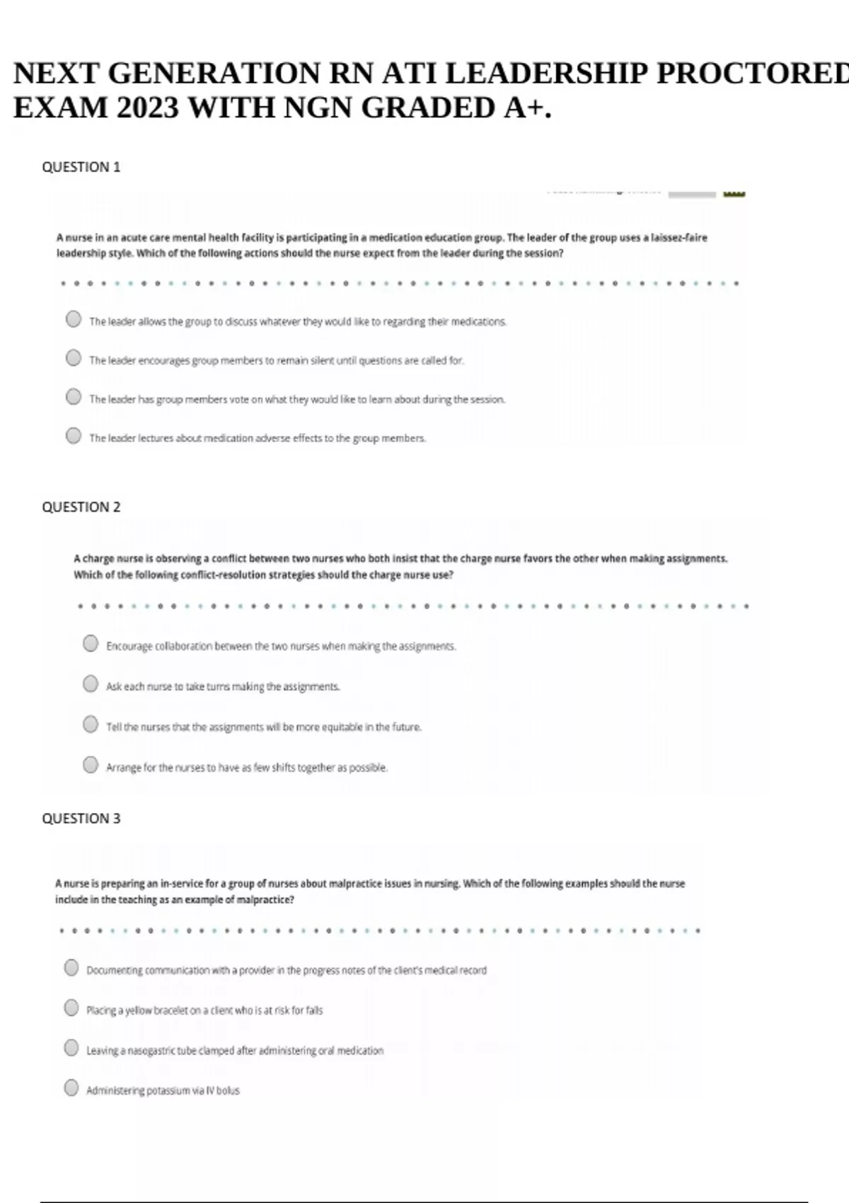 NEXT GENERATION RN ATI LEADERSHIP PROCTORED EXAM 2023 WITH NGN GRADED A+.