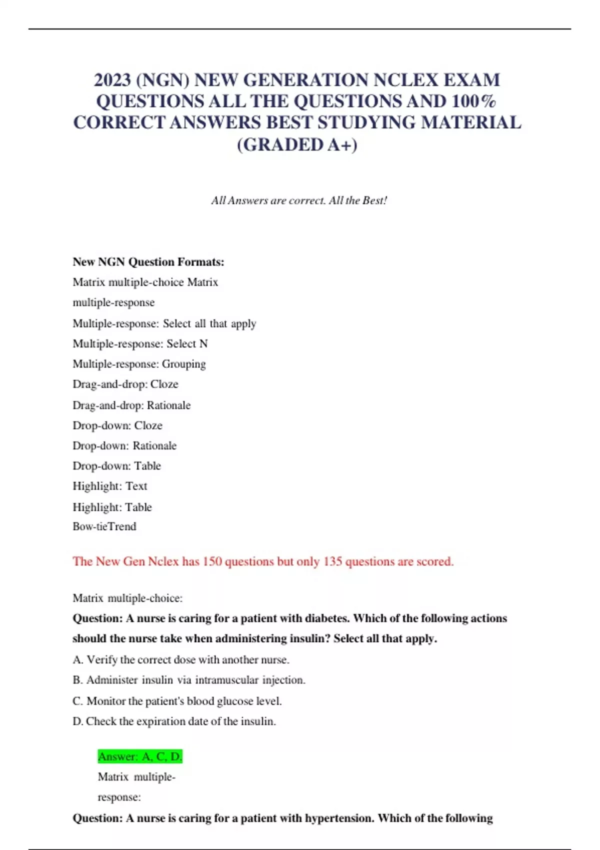 2023 (NGN) NEW GENERATION NCLEX EXAM QUESTIONS ALL THE QUESTIONS AND 100% CORRECT ANSWERS BEST STUDYING MATERIAL (GRADED A+)