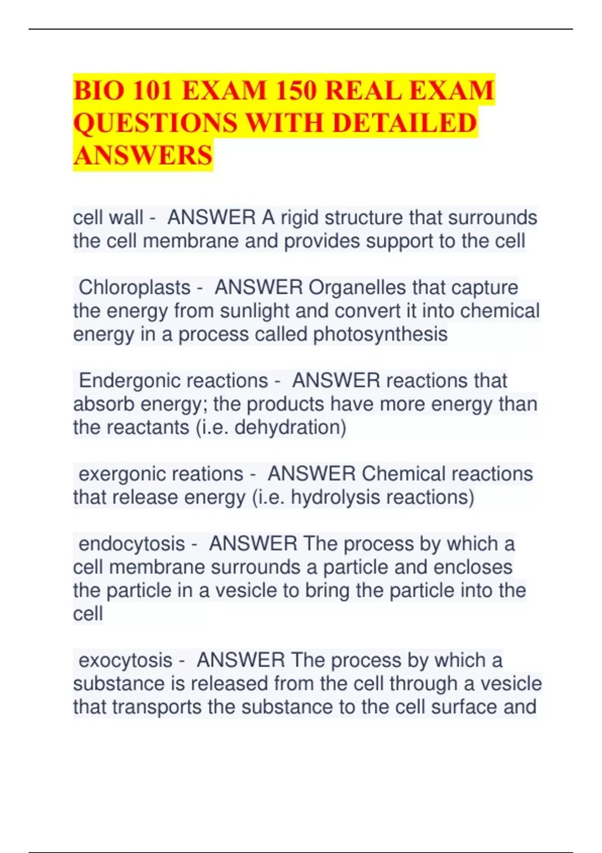 BIO 101 EXAM 150 REAL EXAM QUESTIONS WITH DETAILED ANSWERS cell wall - ANSWER A rigid structure that surrounds the cell membrane and provides support to the cell Chloroplasts - ANSWER Organelles that capture the energy from sunlight and convert it into chemical energy in a process called photosynthesis Endergonic reactions - ANSWER reactions that absorb energy; the products have more energy than the reactants (i.e. dehydration) exergonic reations - ANSWER Chemical reactions that release energy (i.e. hydrolysis reactions) endocytosis - ANSWER The process by which a cell membrane surrounds a particle and encloses the particle in a vesicle to bring the particle into the cell exocytosis - ANSWER The process by which a substance is released from the cell through a vesicle that transports the substance to the cell surface and then fuses with the membrane to let the substance out Pinocytosis - ANSWER A type of endocytosis in which the cell ingests extracellular fluid and its dissolved solutes diffusion - ANSWER Moves molecules from higher to lower concentrations, is PASSIVE transport active transport - ANSWER Moves molecules across cell from lower to higher concentrations, requires energy Photosynthesis - ANSWER Process by which plants use the sun's energy to convert water and carbon dioxide into sugars Greenhouse effect - ANSWER Gases that retain more heat reflected back to Earth rather than into space (esp. CO2, CH4 (Methane), and H2O (water vapor) mitosis - ANSWER When chromosomes are sorted into equal, identical sets meiosis - ANSWER cell division that produces reproductive cells in sexually reproducing organisms (chromosomes sorted into single set) 1st law - ANSWER Energy can be neither created nor destroyed. It can be transformed from one kind to another but the total energy of the universe if constant 2nd law - ANSWER Every energy transfer results in an increasing disorder within the universe. anabolic metabolism - ANSWER Uses dehydration synthesis (release water) reaction to build large molecules from small molecule