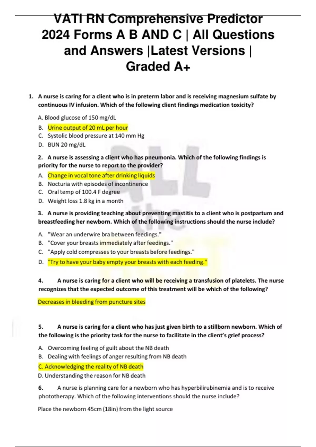 VATI RN Comprehensive Predictor 2024 Forms A B AND C | All Questions and Answers |Latest Versions | Graded A+